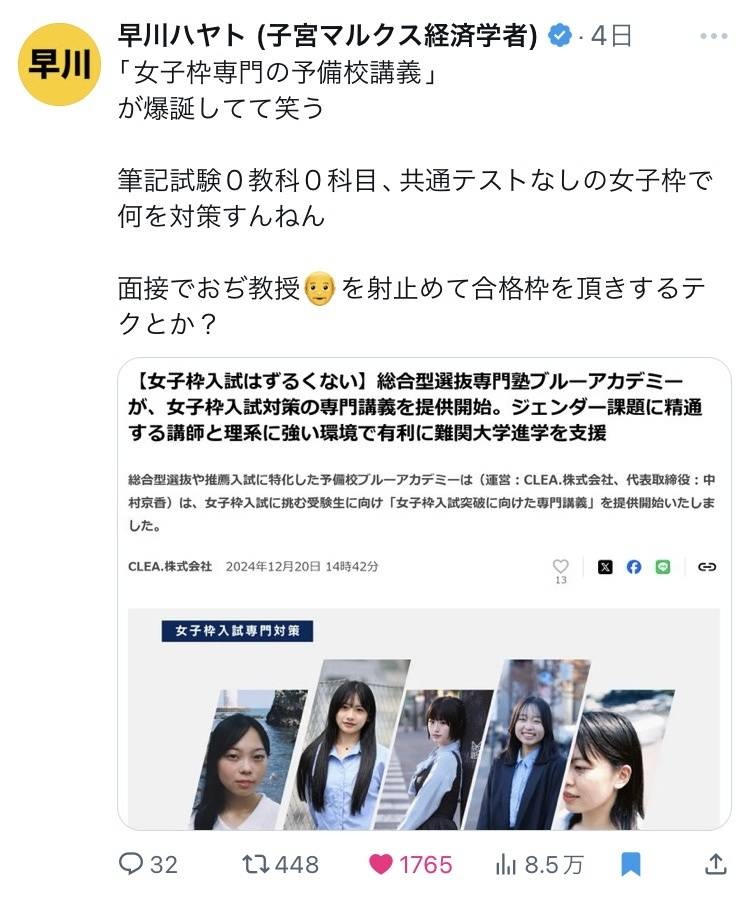 なんと「女子枠専門の予備校講義」も爆誕しとる模様