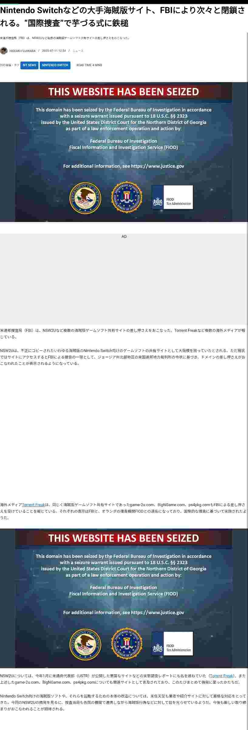 任天堂Switchなどの大手海賊版サイト、FBIにより次々と閉鎖される。国際捜査で芋づる式に鉄槌