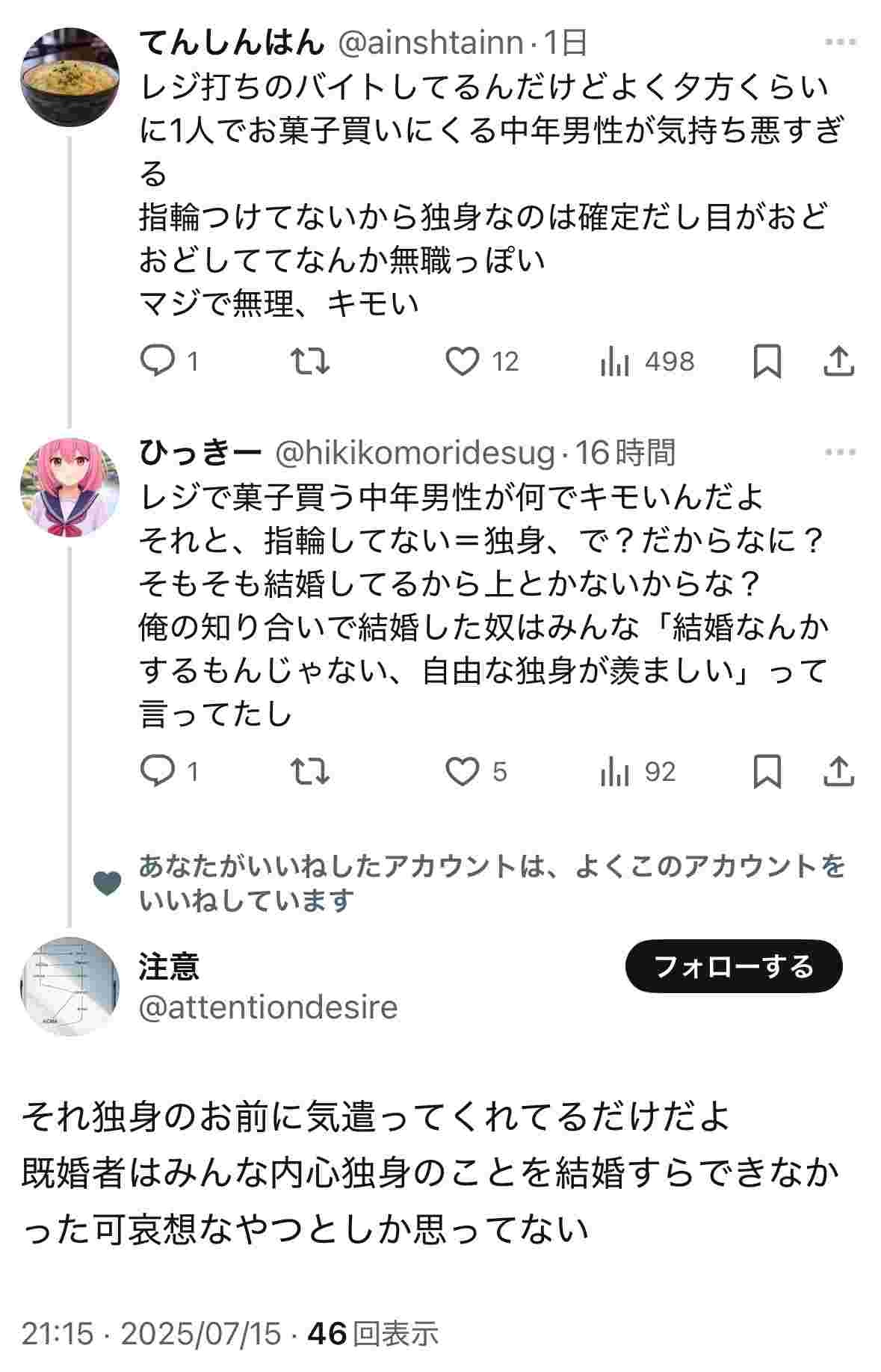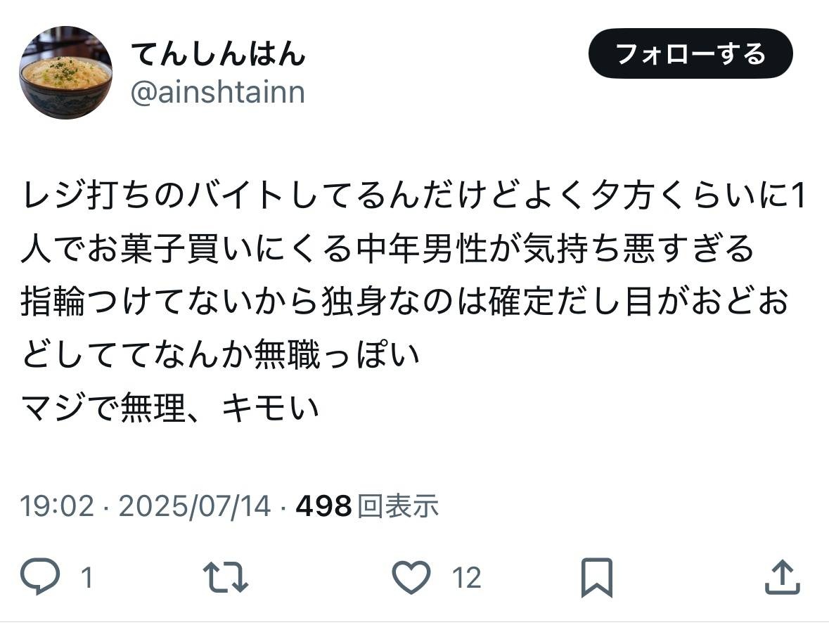 - 実際結婚してわかったけど、独身見て見下すという発想が沸いてこないから単純にバイト店員が他人舐めてるだけのクズってことがよくわかる