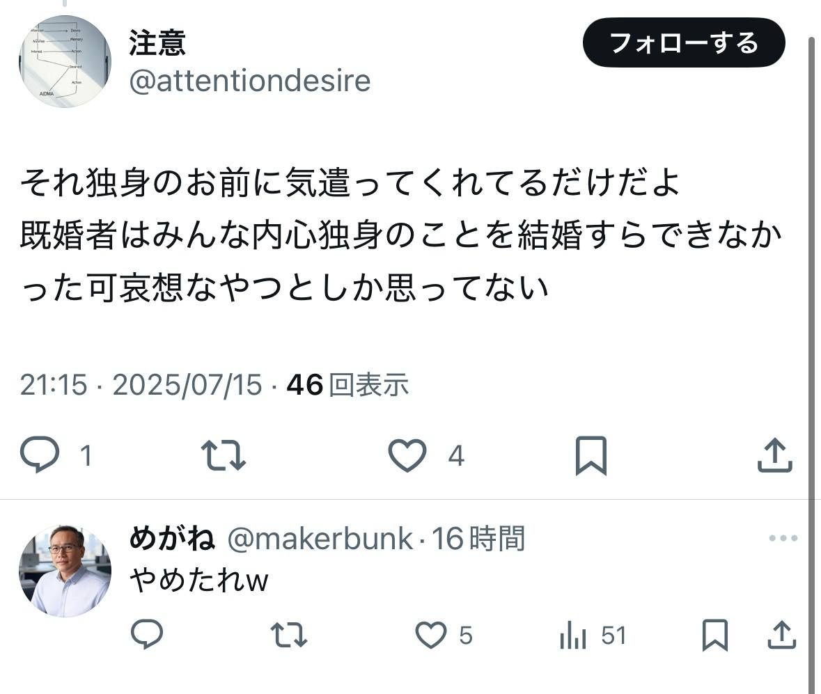 垢消して逃げ出した先も鍵垢で草 - 14 : 2025/07/16(水) 19:01:00.57 ID:YrepdmRDM