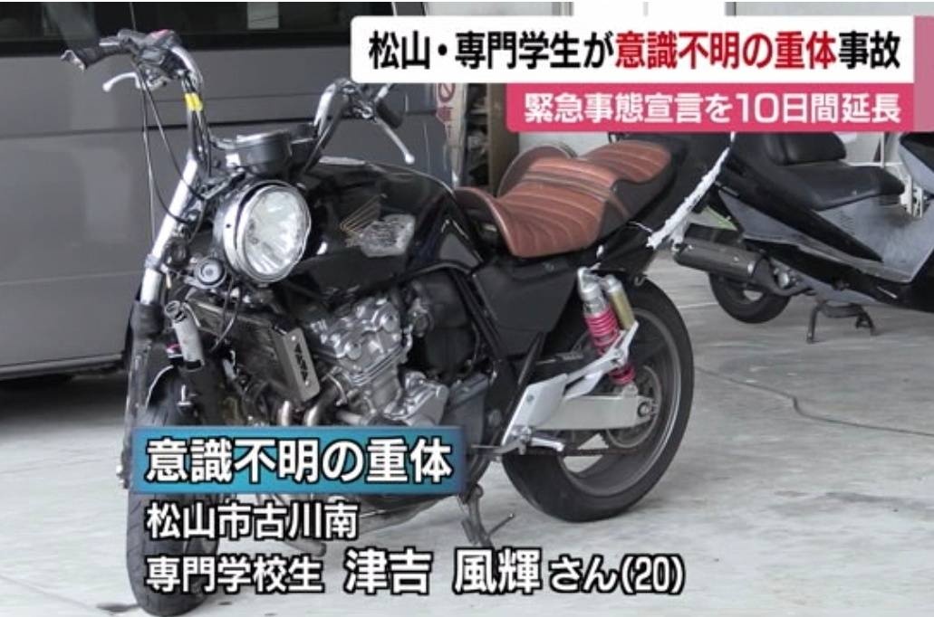 この事故でオートバイを運転していた松山市古川南の専門学校生・津吉風輝さん(20)が頭を強く打ったほか、右脚の骨を折るなどし意識不明の重体になっています。