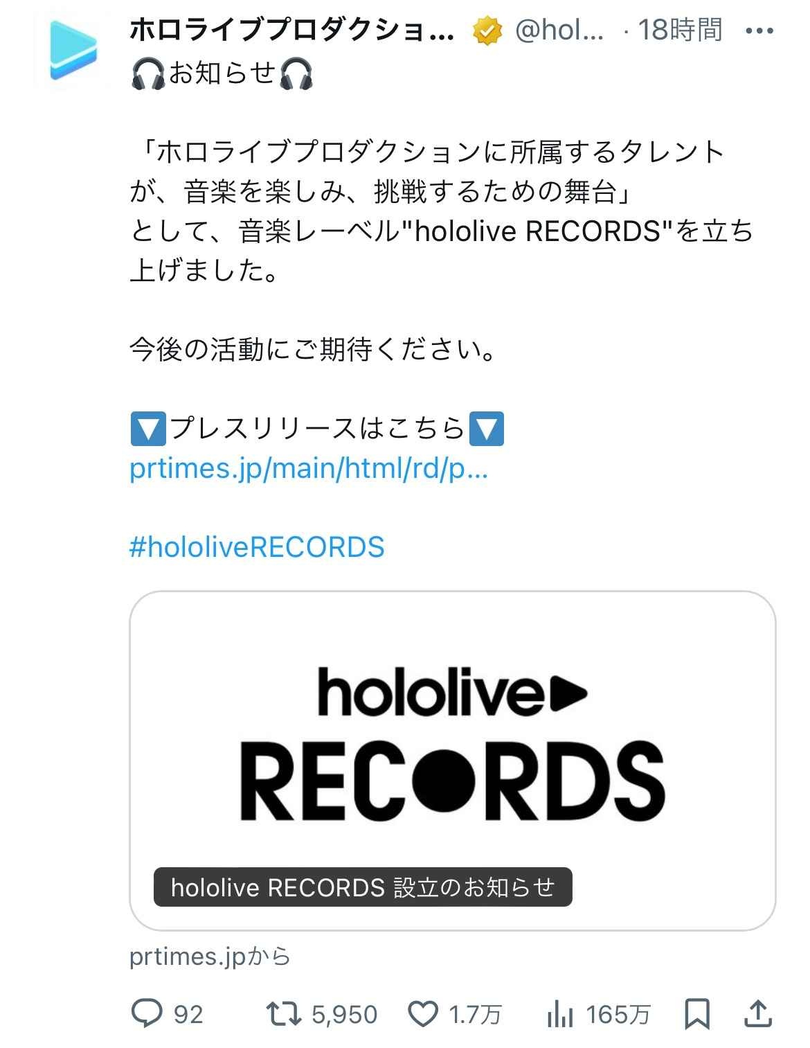 ホロライブ、音楽レーベル『hololive RECORDS』を設立。これ音楽業界ひっくり返るだろ
