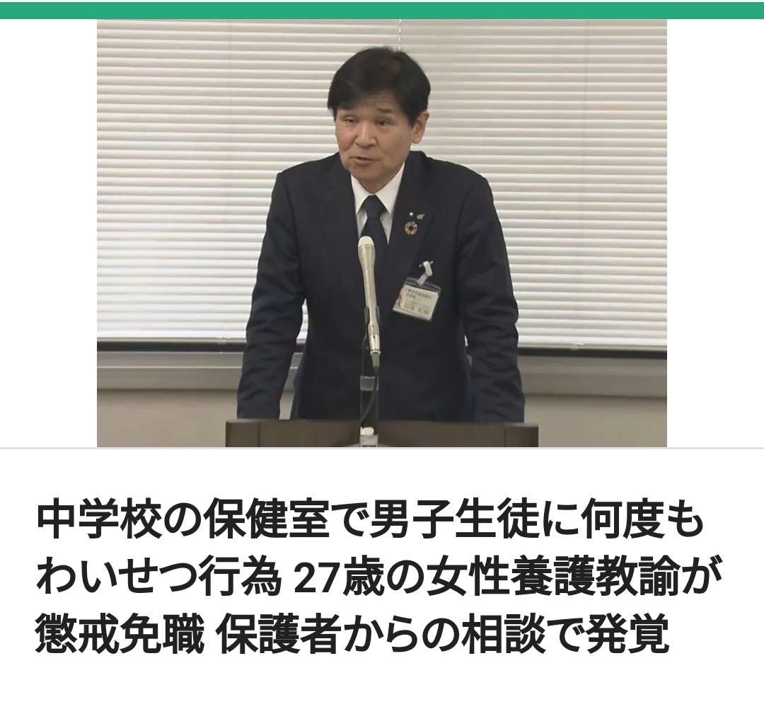 中学校の保健室で男子生徒に何度もわいせつ行為 27歳の女性養護教諭が懲戒免職 保護者からの相談で発覚|FNNプライムオンライン中学校の保健室で男子生徒にわいせつ行為をした女性の養護教諭が、懲戒免職となりました。 三重県教育委員会によりますと、県内の公立中学校の女性養護教諭(27)は2023年、相談のため保健室を訪れた男性生徒に対し、抱きしめたりキスをしたりするなどのわいせつ行為を何度も行っていました。 男子生徒の保護者からの相談で発覚しました...www.fnn.jp - 2 : 2025/07/17(木) 21:01:24.847 ID:u/PmXfCj0