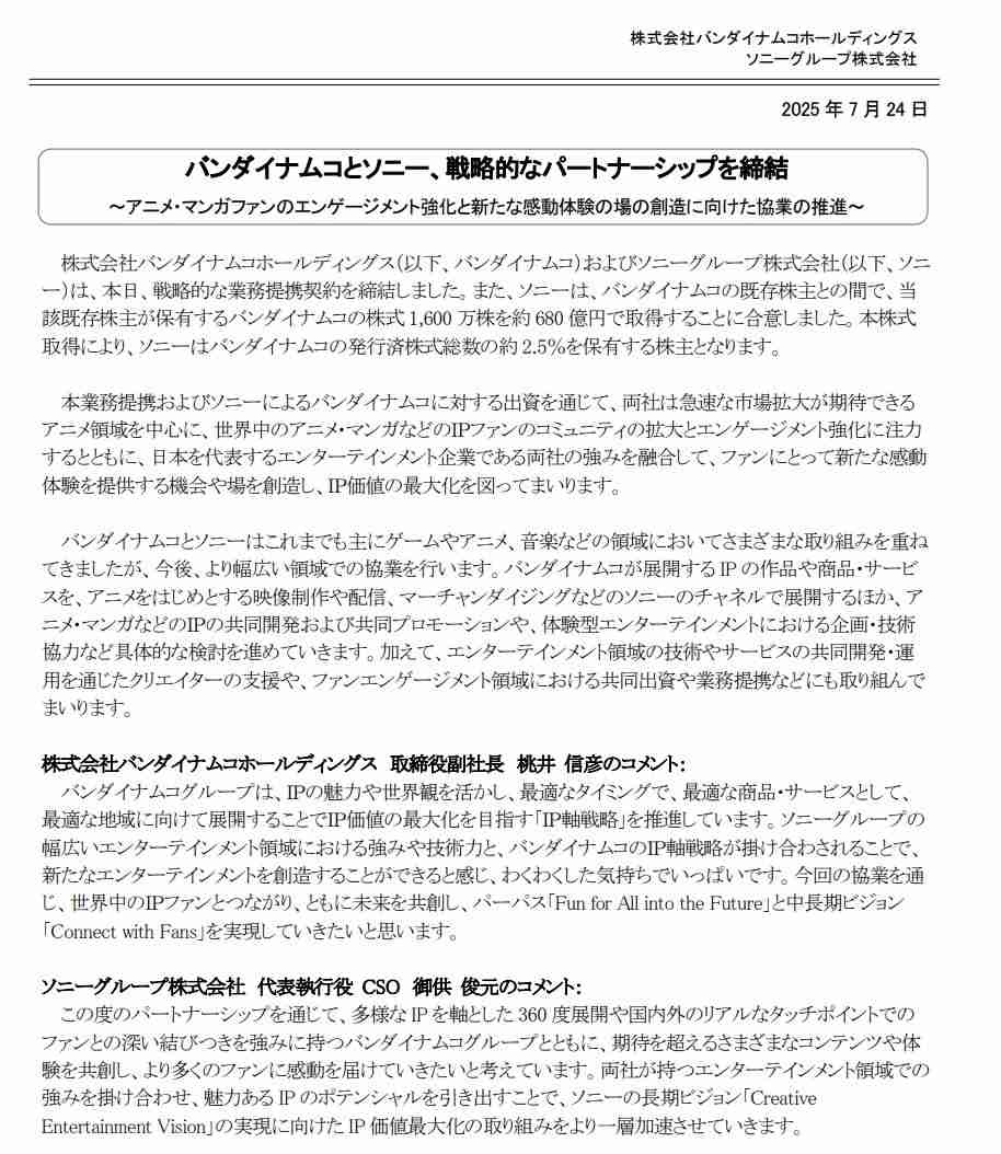 人気IP抱えてるバンナムにSONYの助けが必要とは思えんが - 85 : 2025/07/24(木) 16:13:26.78 ID:Sbo7uMb10