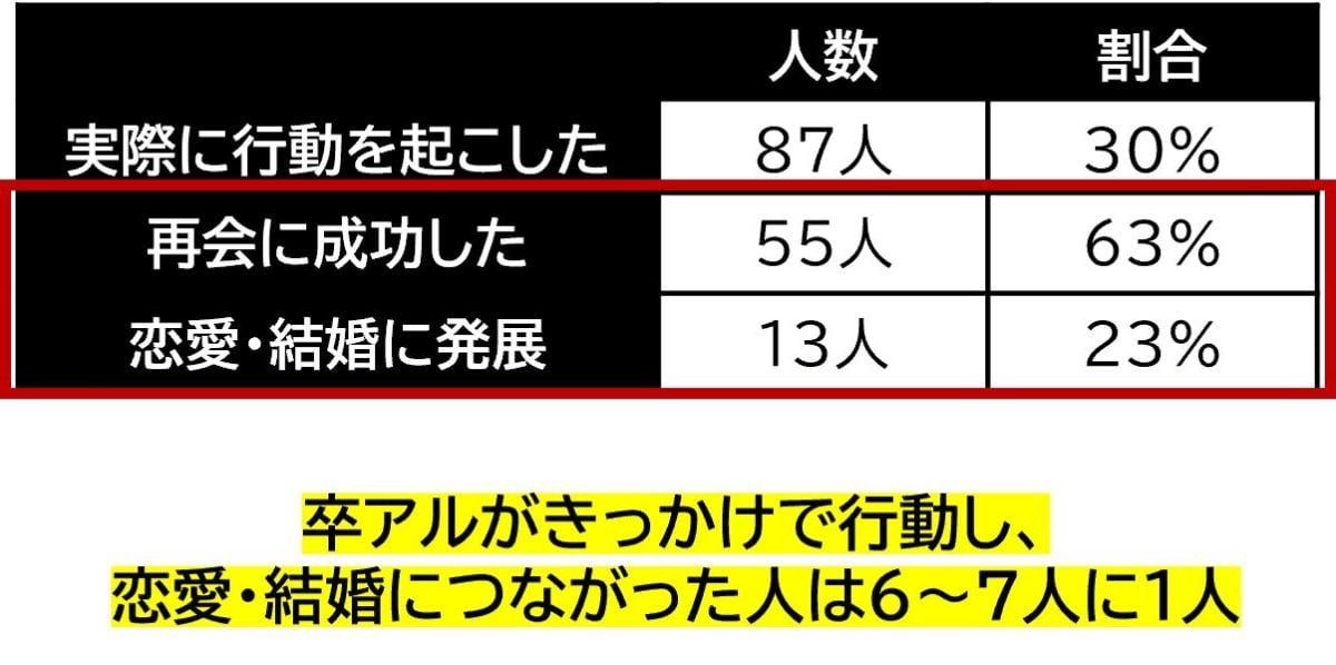 「卒業アルバムを見て恋心が再燃したことがある」と回答した283人の「その後の行動」についても聞くと、「実際に行動を起こした(SNSで検索、実際に連絡を取る、ご飯会を設けるなど)」という人は87人(30%)に上ったことが明らかに。そのうち55人(63%)が「再会に成功した」と回答し、さらに、そのうちの13人(23%)が「恋愛・結婚に発展した」ことが分かりました。卒業アルバムがきっかけで行動し、恋愛・結婚につながった人は6?7人に1人の割合で存在するようです。