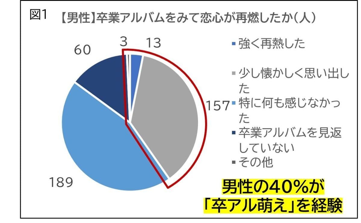男女別に見てみると、「恋心の再燃」を経験している男性が40%を占めた一方で、女性は29%にとどまる結果に。同社は「男性の方が、卒業アルバムを通じて過去の恋愛感情を呼び起こしやすい可能性が示唆されます」と分析しています。
