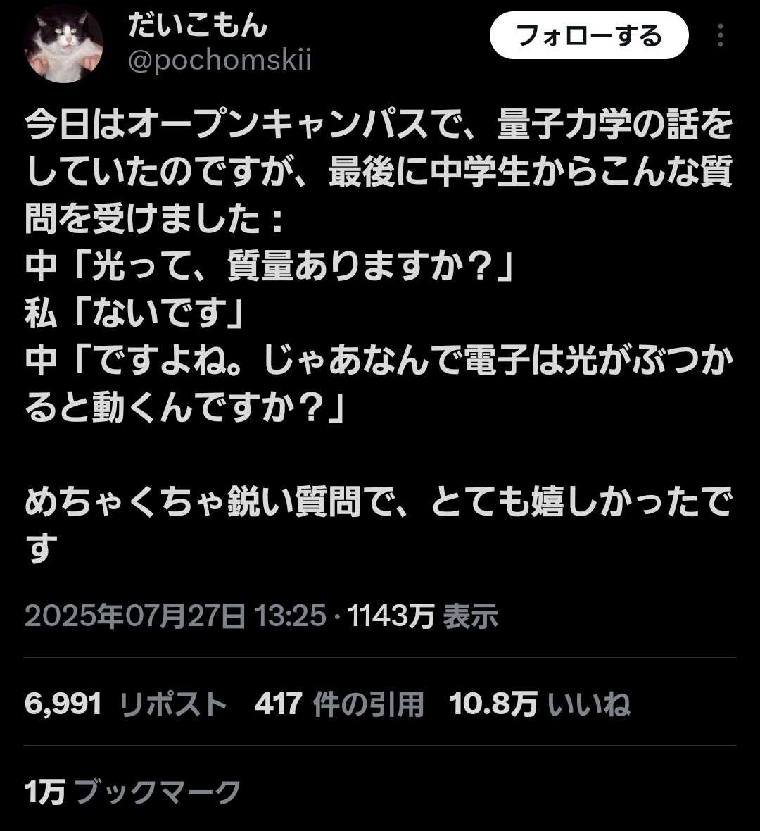 中学生が量子力学について鋭い質問をしてしまう👈10万いいね