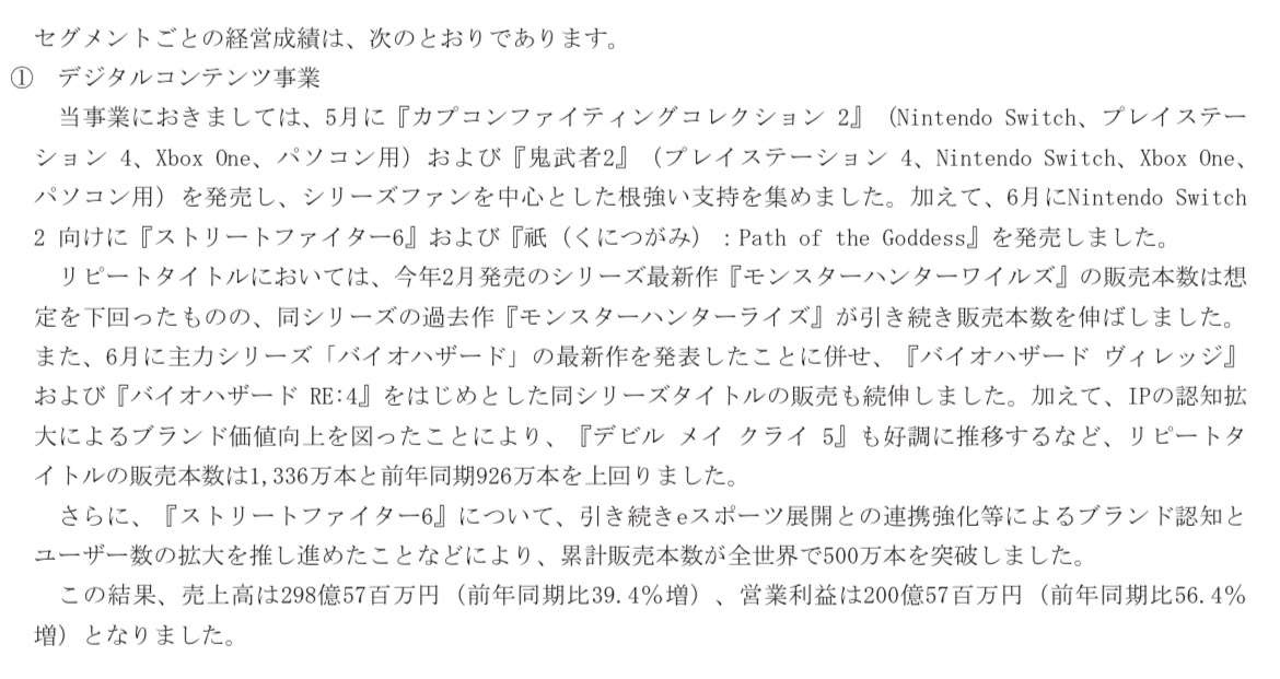 カプコン株主資料「モンハンワイルズの販売本数は想定を下回ったもののー