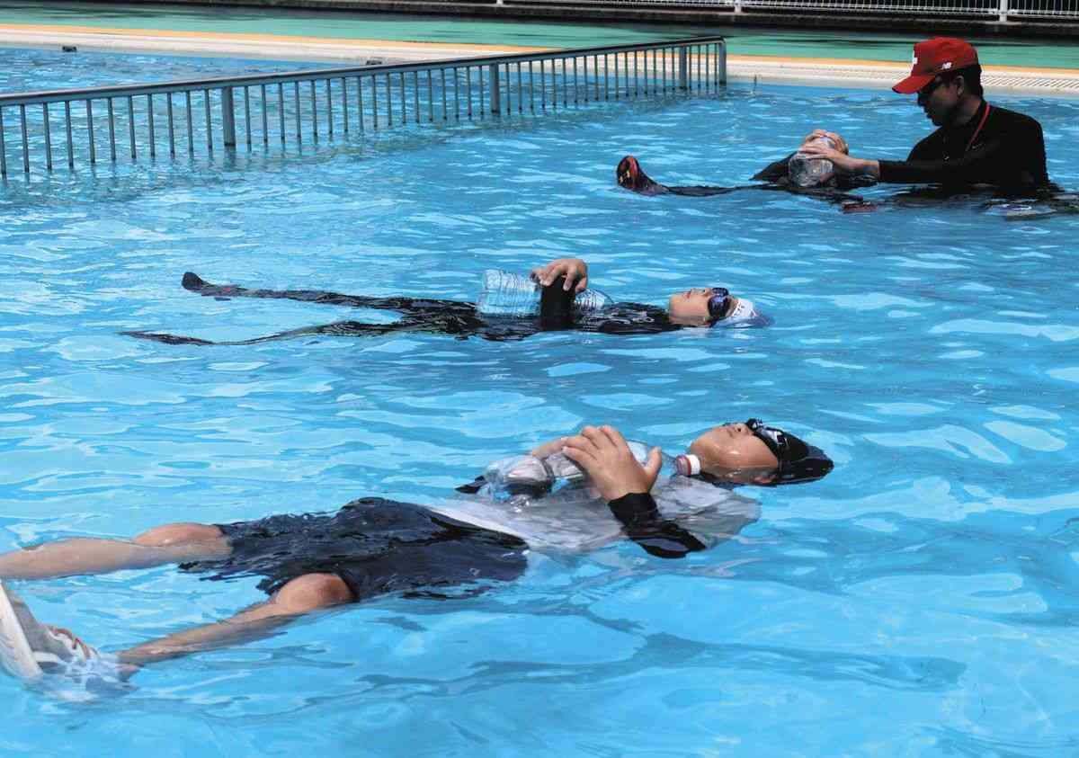 夏休みを迎え、川や海に出かける子どもたちが気を付けたいのは水難事故だ。岡崎市桜形町の形埜小学校では31日、服を着たまま水に溺れた時の対処法を学ぶ授業が開かれ、希望した児童23人が合言葉「ういてまて」を実践した。