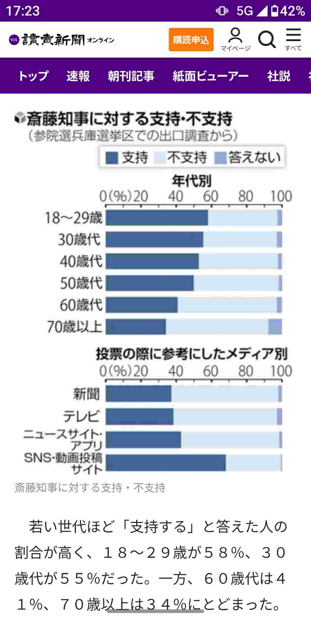 - 読売新聞社が参院選投開票日(7月20日)に兵庫選挙区(改選定数3)で実施した出口調査で、兵庫県の斎藤元彦知事を支持するかどうか尋ねたところ、「支持する」が46%、「支持しない」が50%だった。