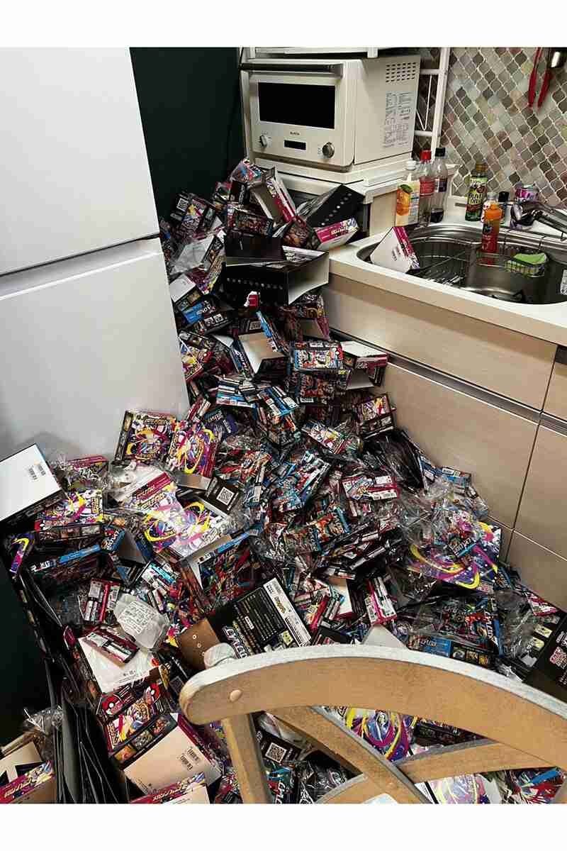 今月2日、SNS上に投稿された写真には、前日1日に発売されたばかりのポケモンカードゲーム新シリーズ「メガブレイブ」「メガシンフォニア」の空き箱や開封されたカードの山が、民泊の一室にうず高く積まれた様子が収められている。