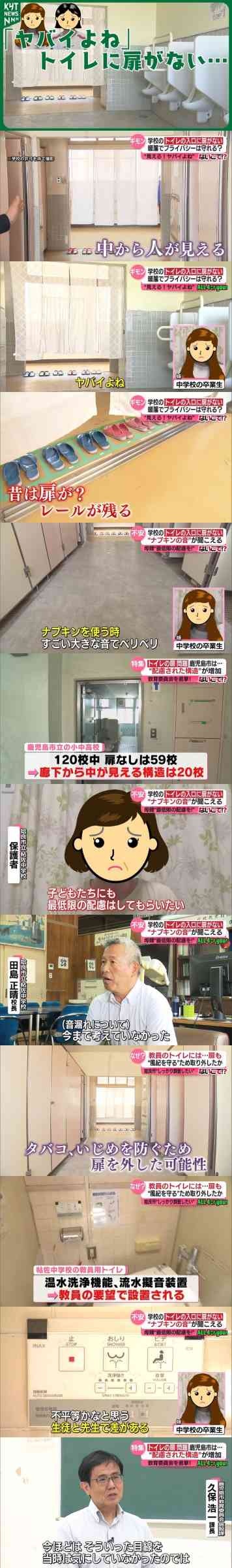 鹿児島市立の小中高校、120校のうち扉がないのは59校。このうち、廊下からトイレの中が見える作りの学校は20校あるそうです。