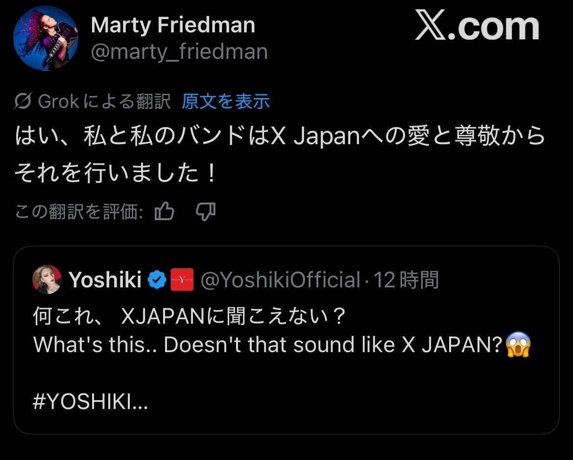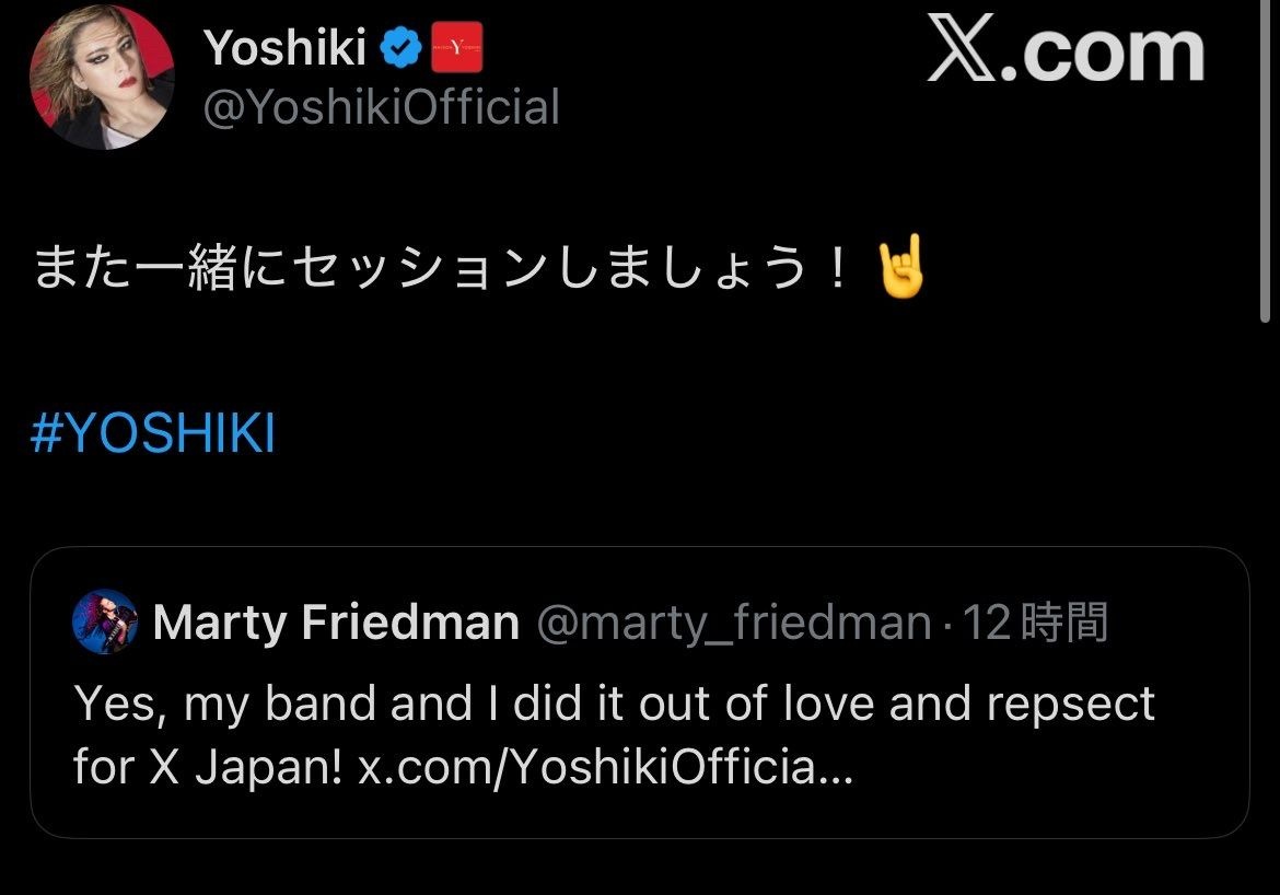 マーティー・フリードマン「リスペクト込めて弾かせてもらったよ!」 YOSHIKI「また一緒にセッションしましょう!🤘」