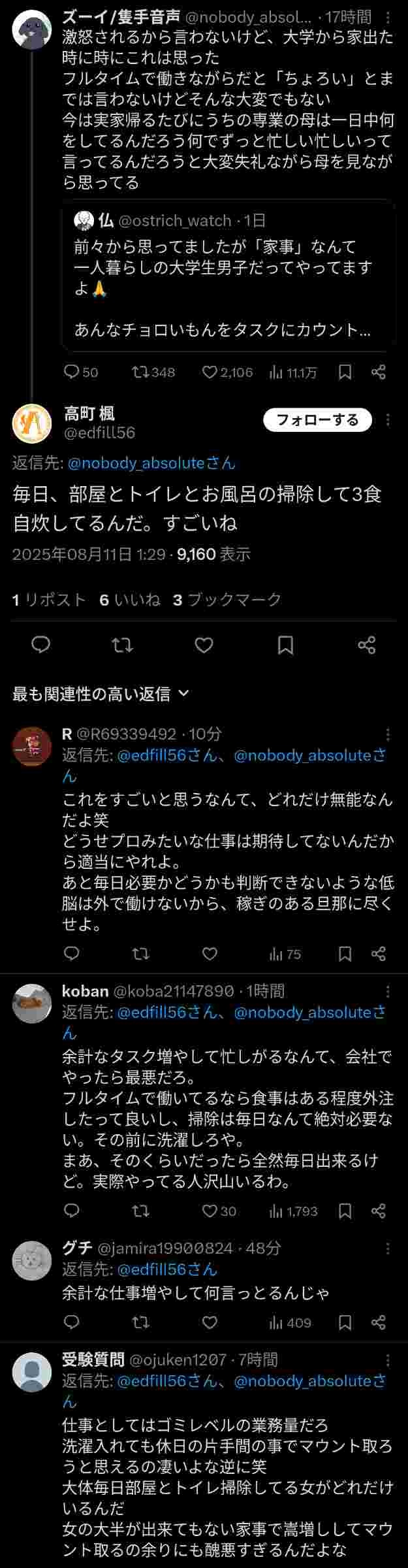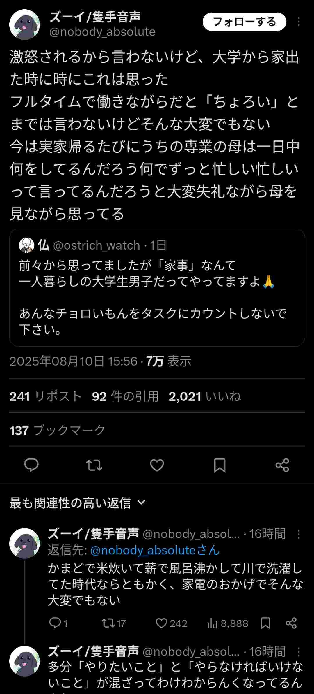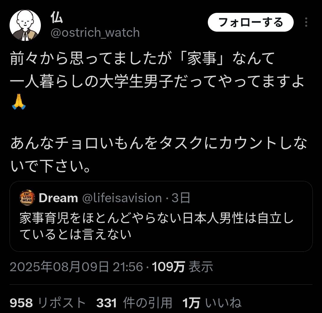 時給換算するとどうのとか、馬鹿みたいにタスク細分化した主婦の1日の画像とかさ - 43 : 2025/08/11(月) 10:07:31.07 ID:C6O22UIb0