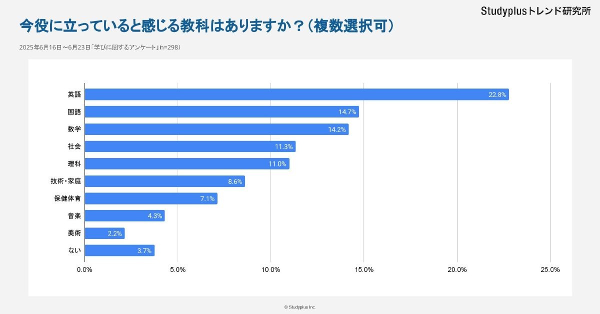 まずは「今後の人生に役に立ちそうだと感じる教科」について聞きました。他の教科を引き離して「英語」(24.1%)が高く、ついで「国語」(14.0%)「社会」(12.9%)が続きました。https://static.wixstatic.com/media/f6eba9_b478087f723342ee91c83e3119b28492~mv2.jpg/v1/fill/w_740,h_387,al_c,q_80,usm_0.66_1.00_0.01,enc_avif,quality_auto/f6eba9_b478087f723342ee91c83e3119b28492~mv2.jpg