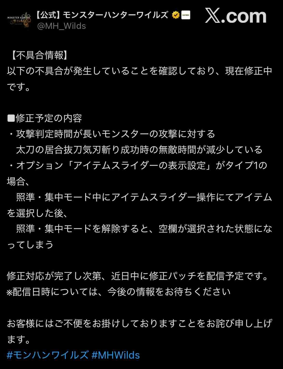 モンハンワイルズ公式「太刀のサイレントナーフはしてません!不具合です!!不具合!!!」