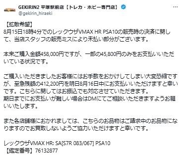 同店は「【拡散希望】」と前置きし「8月15日18時4分でのレックウザVMAX HR PSA10の販売時の決済に関して、当店スタッフの販売ミスにより未払い部分がございます」と告知。「本来ご購入金額458,000円ですが、一部の45,800円のみをお支払いいただいている状況です」と説明し「ご購入いただきましたお客様にはお手数をおかけしてしまい大変恐縮ですが、至急残額の412,200円を明日8月16日中にお支払いいただけますと幸いです」と呼びかけた。