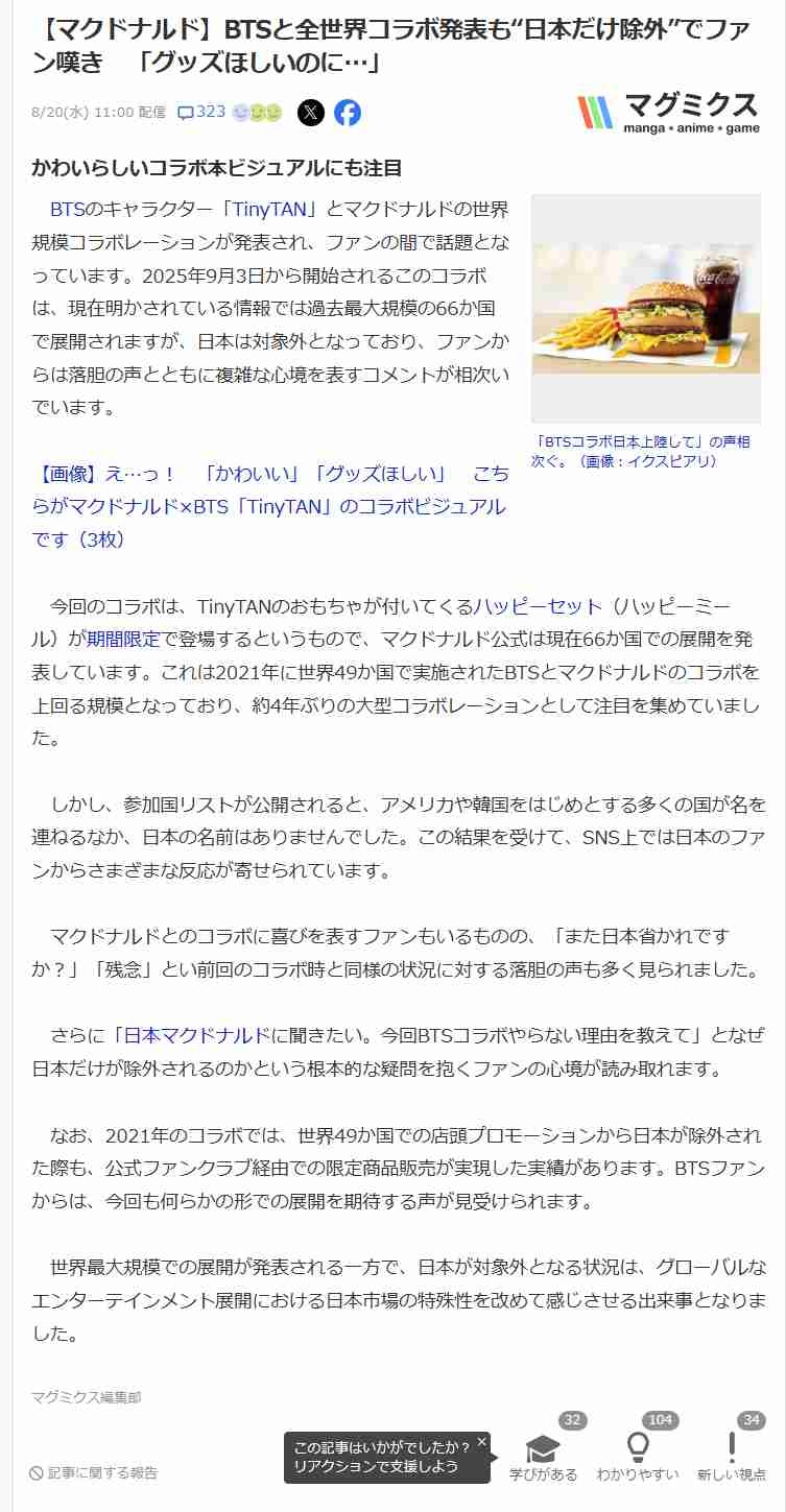 マクドナルド、ポケカの転売批判でうるせえからBTS全世界コラボ日本だけ除外しまーす
