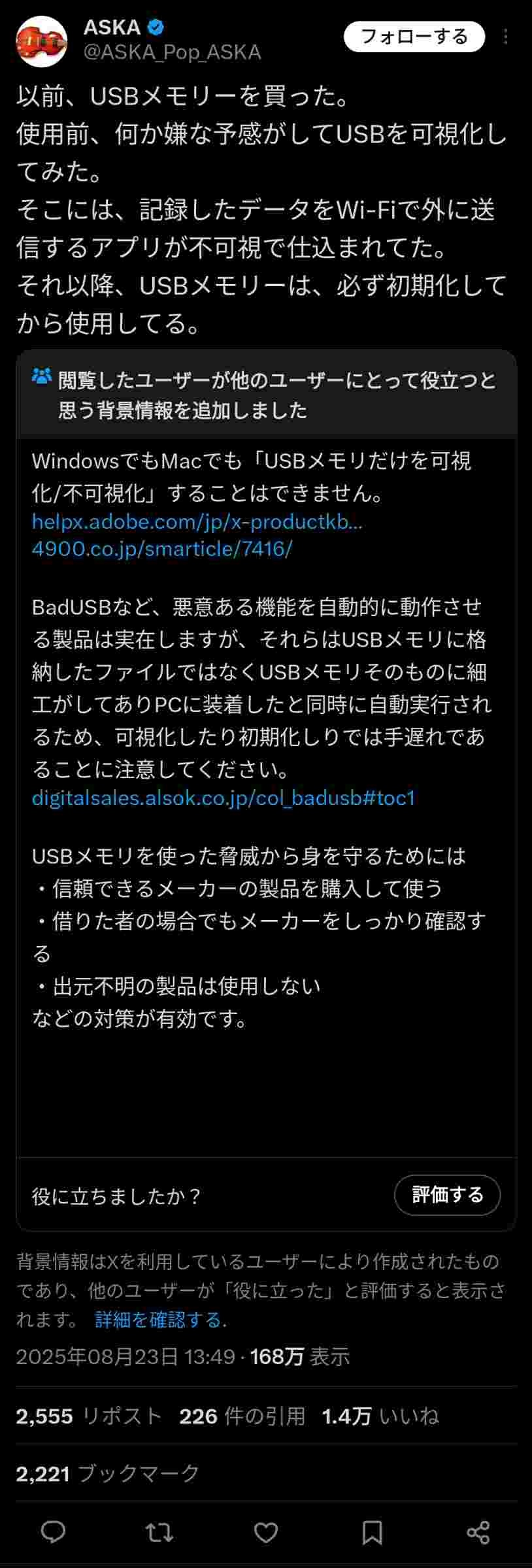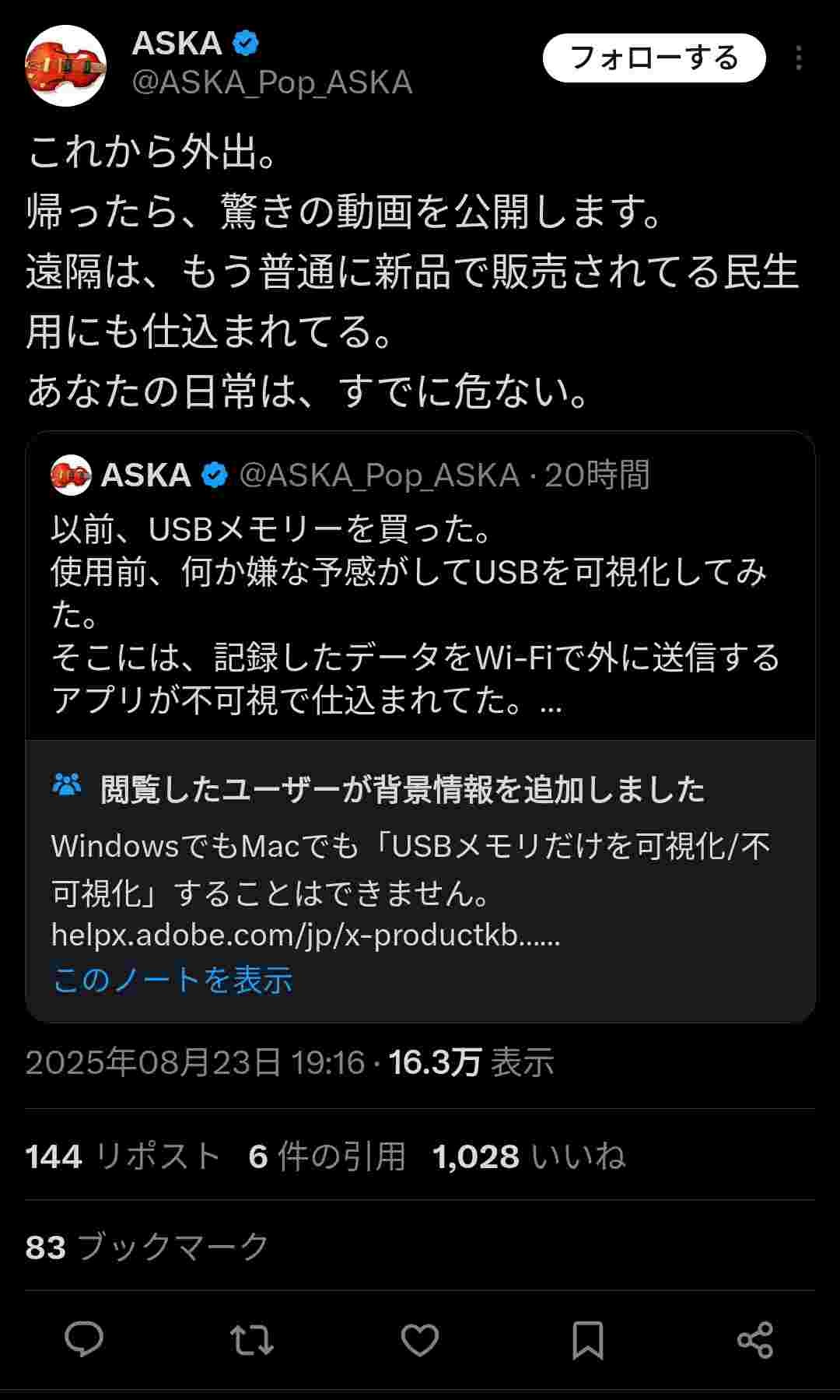 【安倍】ASKAが告発「買ったUSBを可視化してみたら、記録したデータをWi-Fiで外に送信するアプリが不可視で仕込まれてた」