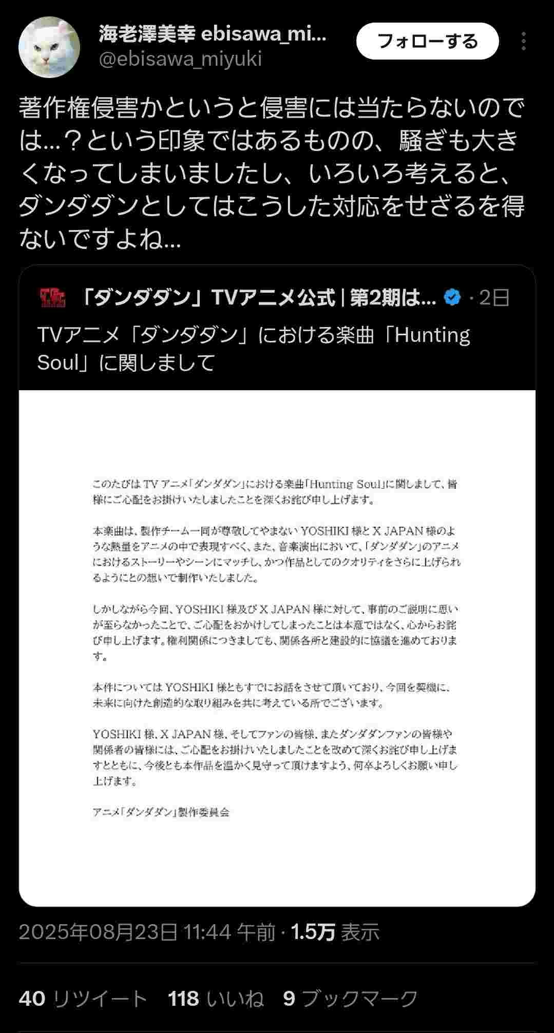 紀藤弁護士「ダンダダンはYOSHIKIの何らかの権利を侵害している!」→炎上