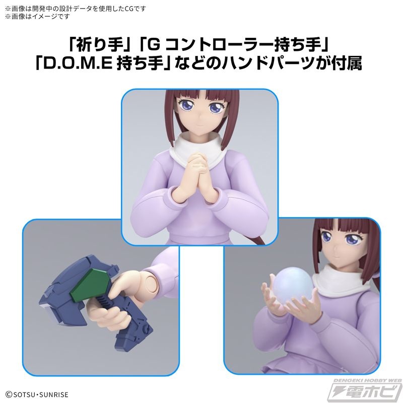 表情パーツはタンポ印刷を施した2種が付属。劇中イメージを再現できる椅子と脚部パーツ、D.O.M.E、Gコントローラー、ロングヘアーパーツなど豊富な付属品に注目です。また、「祈り手」、「Gコントローラー持ち手」、「D.O.M.E持ち手」など豊富なハンドパーツも付属。