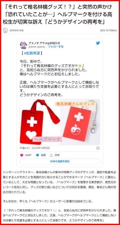2022年椎名林檎がアルバムのグッズで「外見ではわからない障害を持つ人がつける」ヘルプマークを模したグッズを発売することを発表