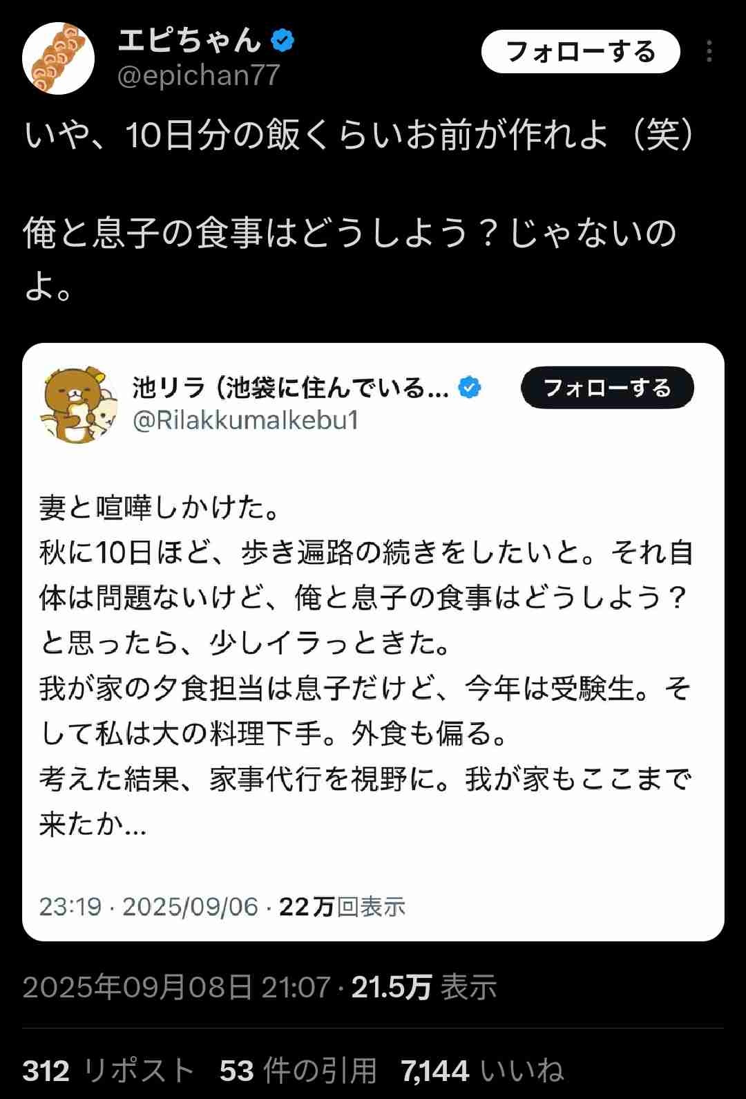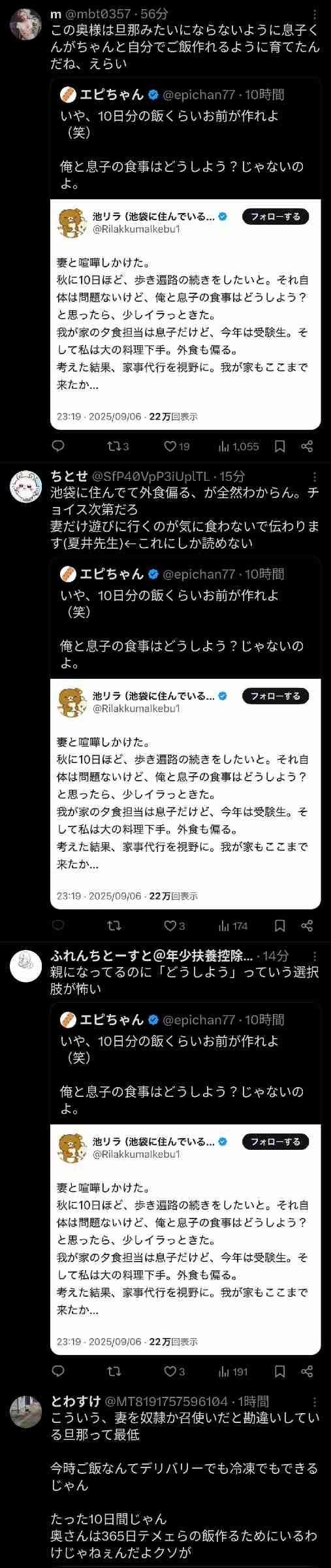 大事なシーズンに行かなくてもいい旅行行くのもどうかと思うが10日分の飯も作れない男もカスだわ