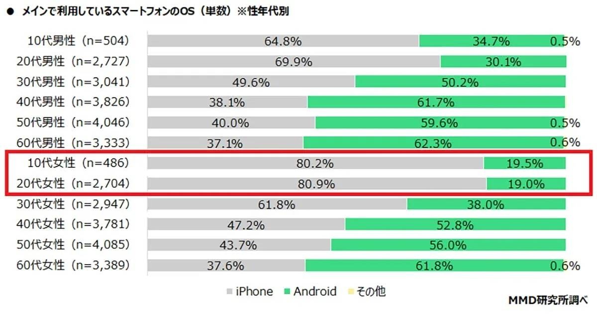 10代女性のほうが12%以上もiPhone率が高いのは、やはり周りから浮いてしまうことを嫌う傾向にあるからでしょう。