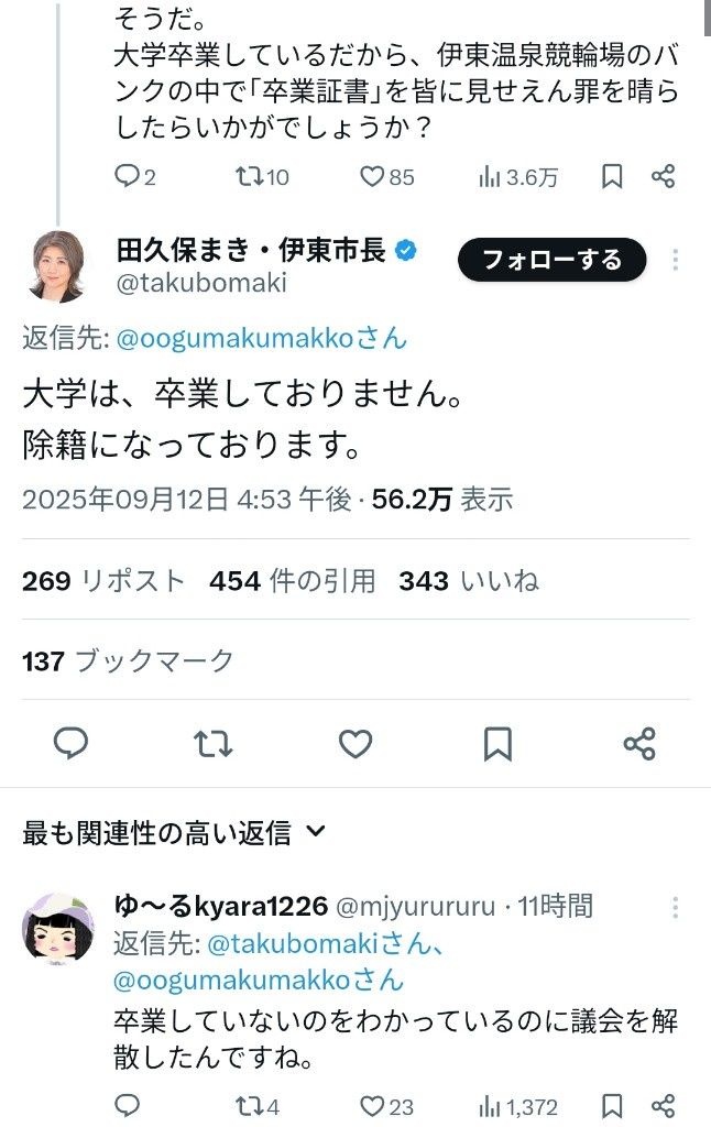 田久保市長「大学は、卒業しておりません。除籍になっております。」