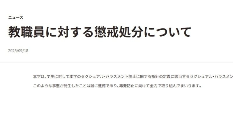 同サイトでは、「教職員に対する懲戒処分について」と題して、「本学は、学生に対して本学のセクシュアル・ハラスメント防止に関する指針の定義に該当するセクシュアル・ハラスメント行為を行った本学教員1名の懲戒解雇を決定いたしました」と報告。