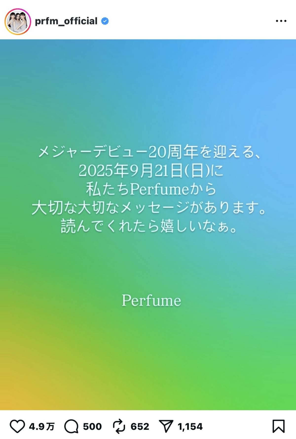 19日までにユニットの公式サイトやSNSで「メジャーデビュー20周年を迎える2025年9月21日(日)に、私たちPerfumeから大切な大切なメッセージがあります。読んでくれたら嬉(うれ)しいなぁ」と伝えた。