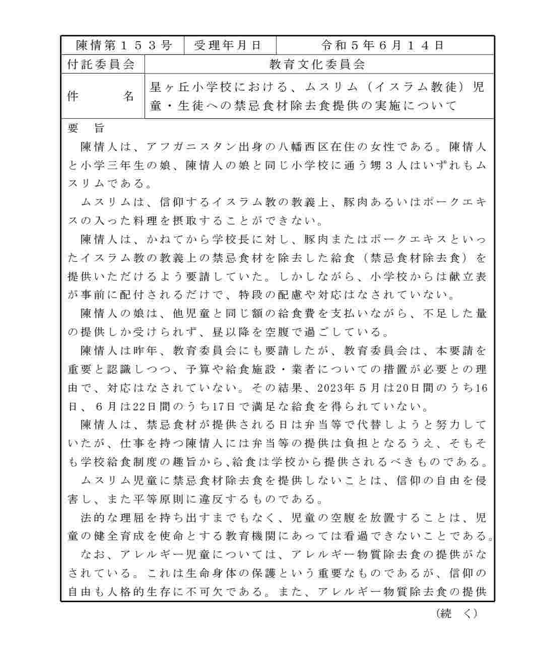 陳情書読んだら、アレルギーの子には対応給食出してるっぽい。さらには陳情内容はハラル食の提供ではなく豚肉(ポークエキス)除去食の提供だから、アレルギー除去食ができて豚肉除去ができない技術的障壁もない