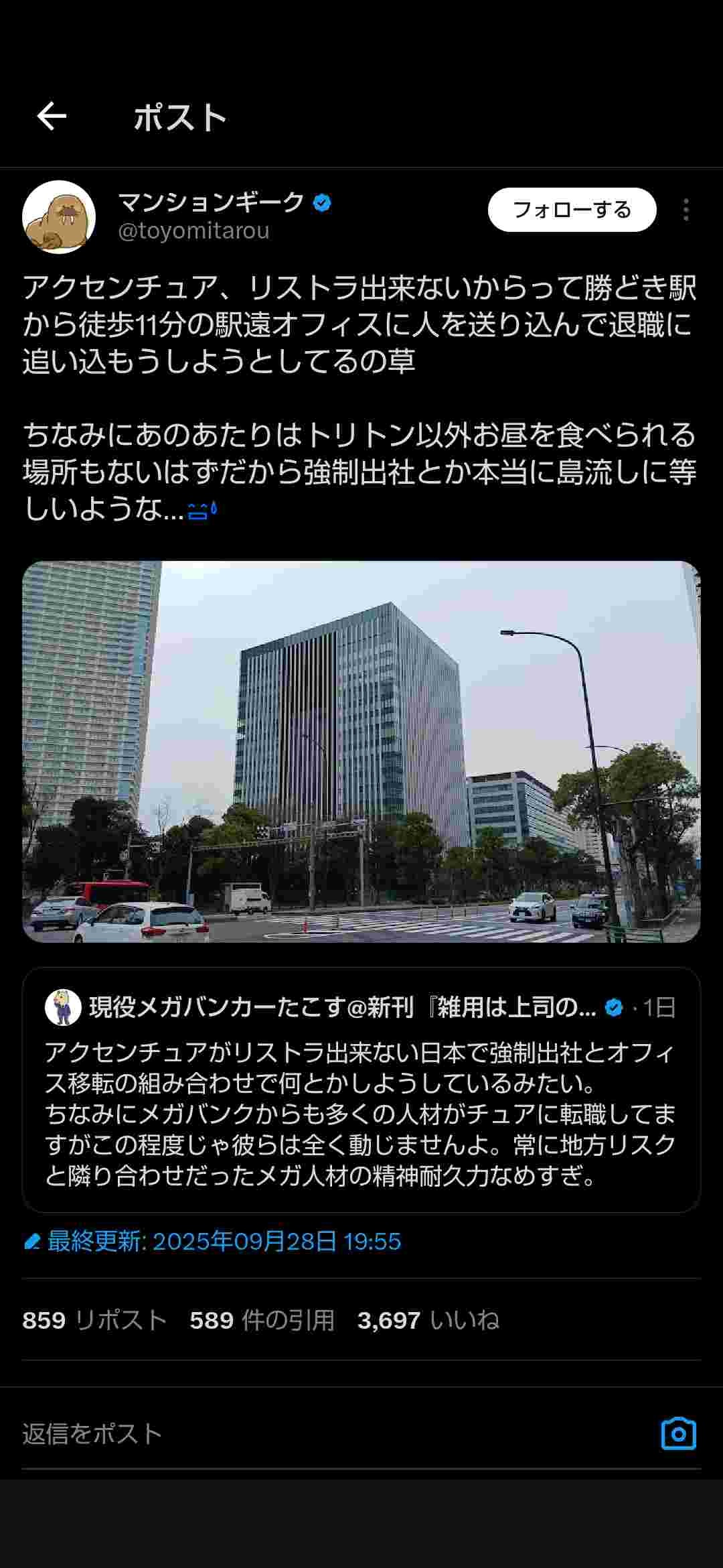 元アクセンチュアです!とイキった所でこの時期の退職者は例のオフィスやろうと察し - 14 : 2025/09/30(火) 08:19:42.20 ID:/YKC+s7v0