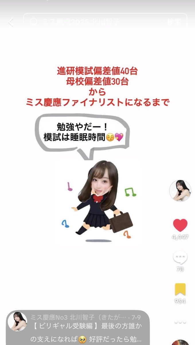 ミス慶應No3 北川智子 (@misskeio2025_3) on X沢山見て頂いてた動画のリクエスト版作ってみた💖 まだ声聞いた事ない方、想像通りでしたか💭😖↓ #ビリギャル #ミス慶應 #ミスコン #女子大生 #慶應 #大学受験x.com↑