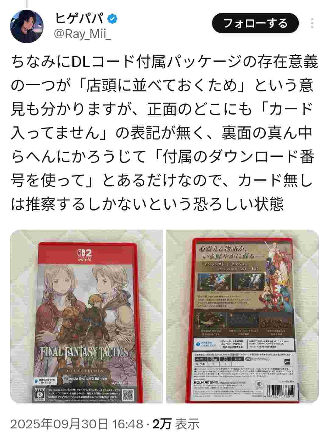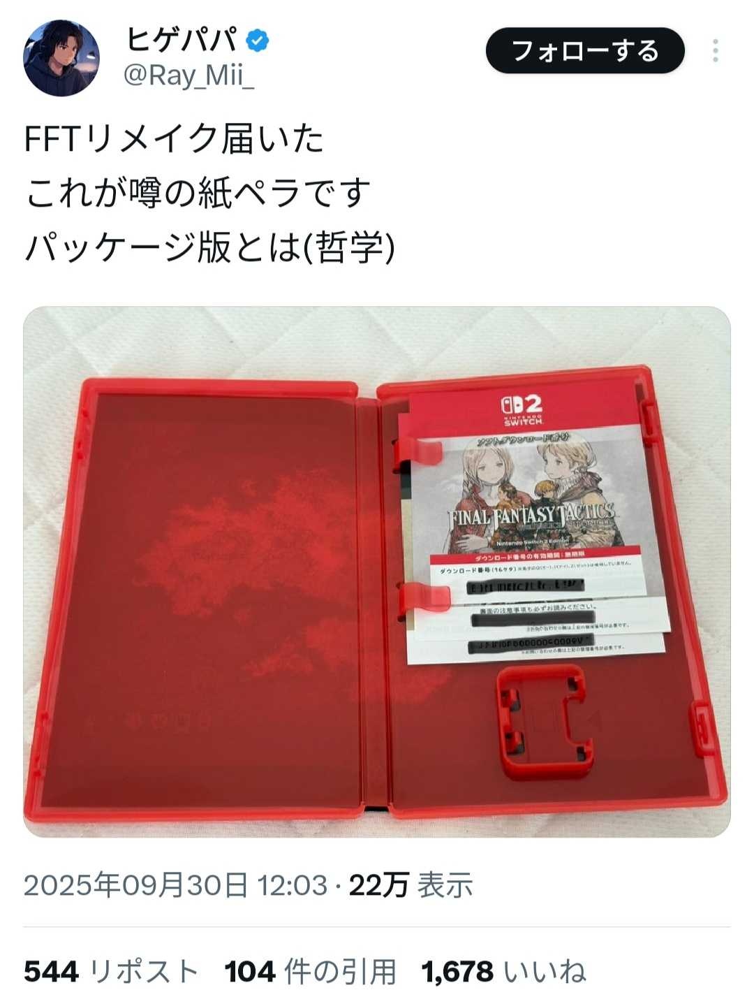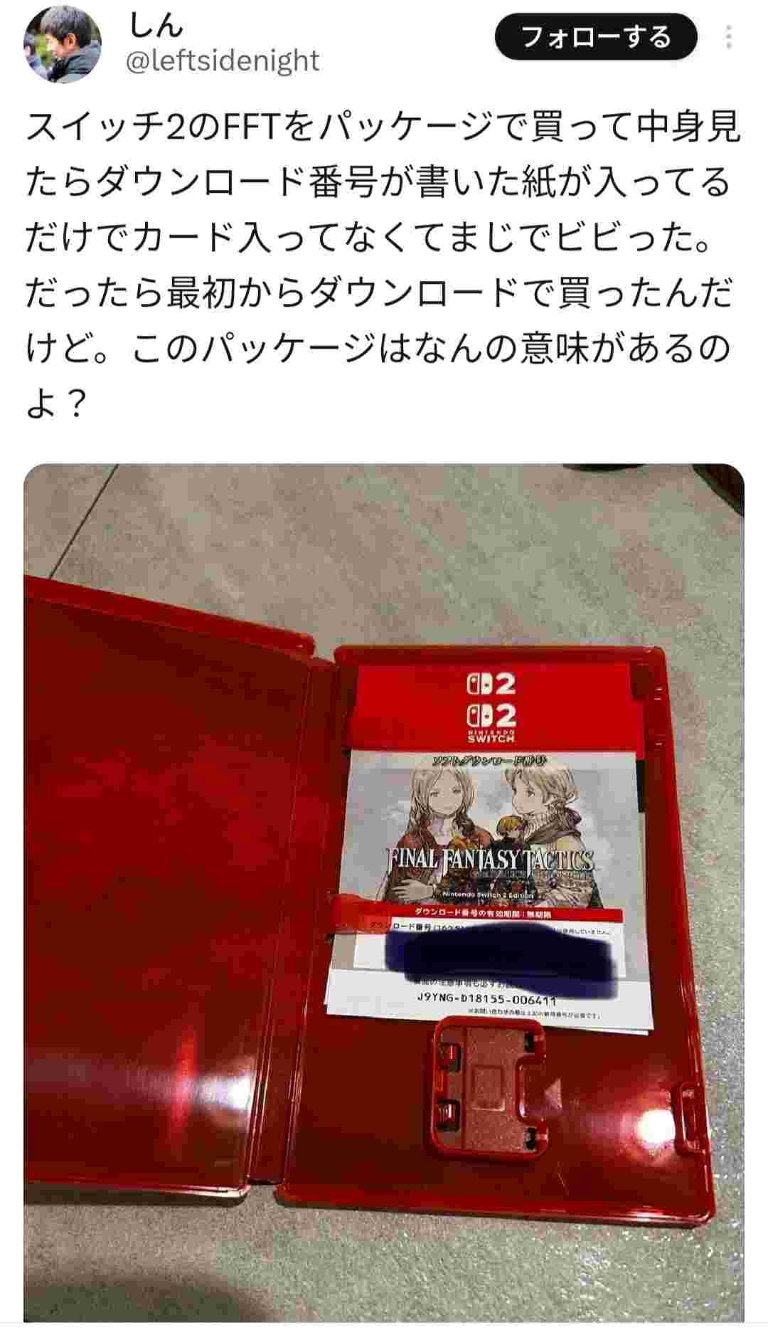 FFTのパッケージ版(Switch2エディション)を購入した人たち「ウッキウキで開封したら紙1枚しか入ってない。何の為のパケ版だよ」と激おこ