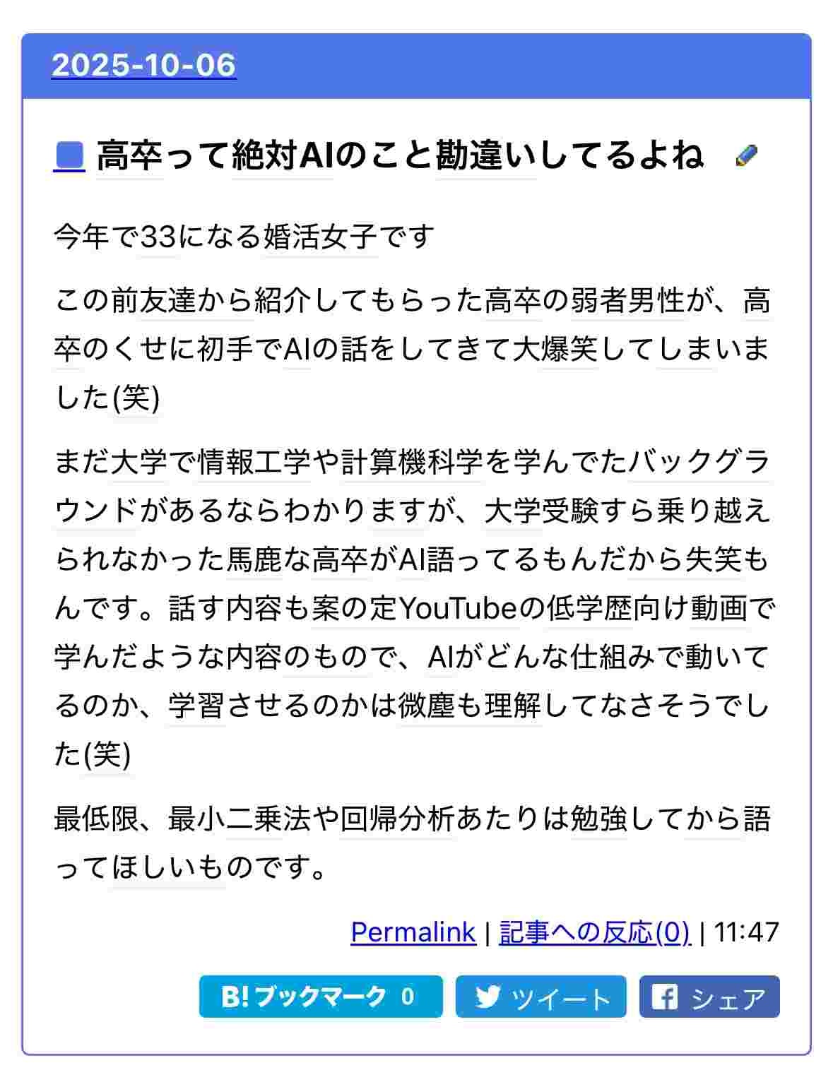女さん「高卒のくせに『AI』を語ってる弱者男性ってなんなの?最小二乗法も理解できない低学歴がAI語るなよ!」8万いいね
