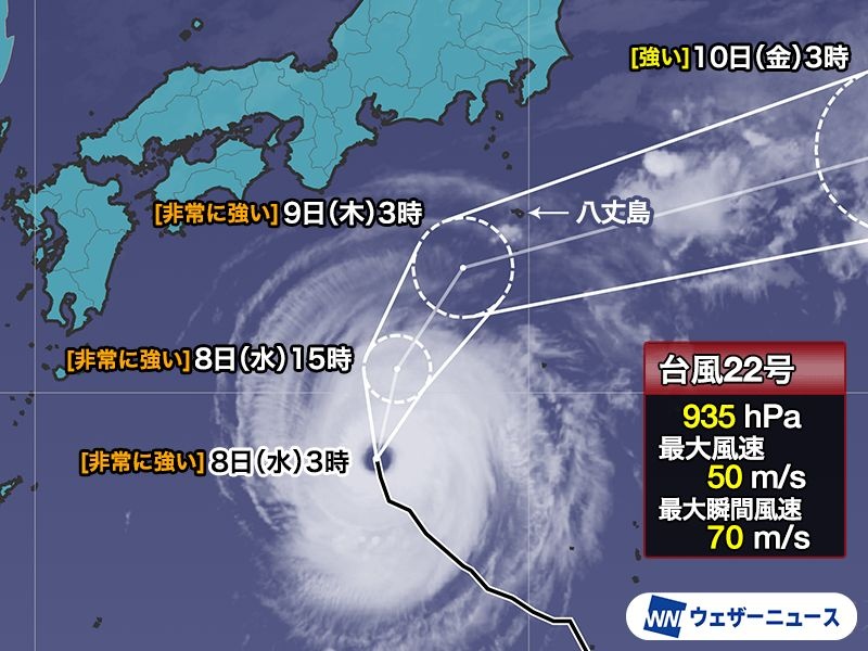 伊豆諸島には発達のピークを迎えたままかなり接近するため、暴風が吹き荒れるおそれがあります。高潮による沿岸部の浸水にも厳重な警戒をしてください。