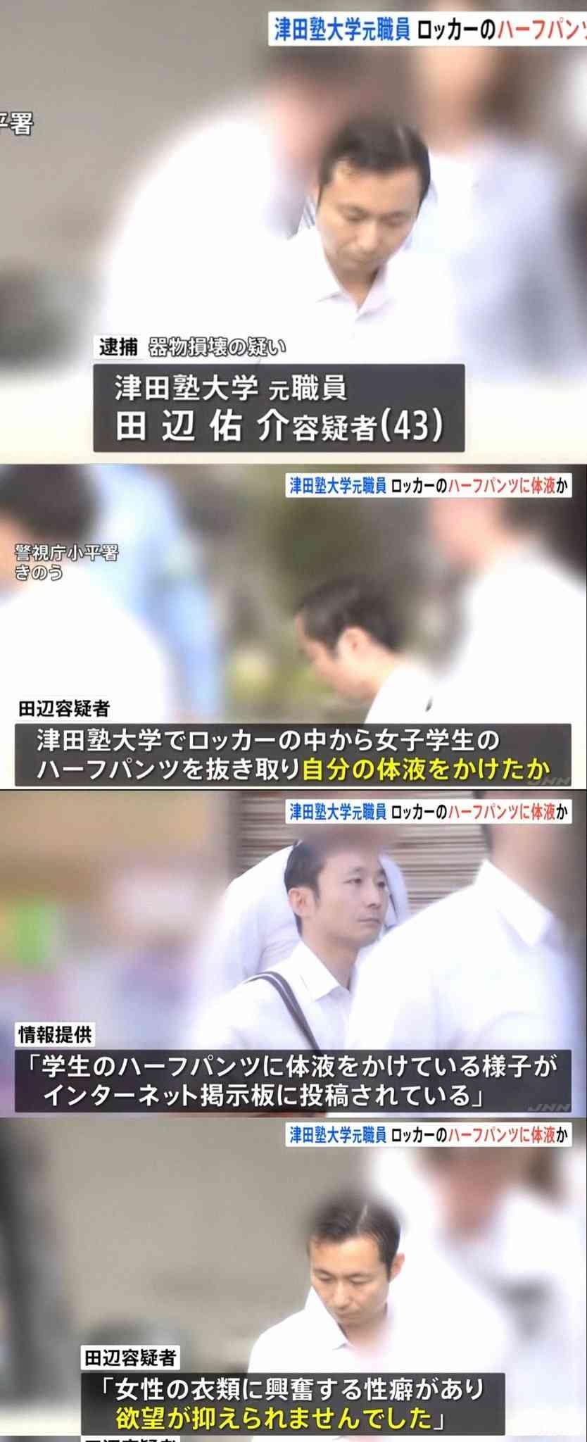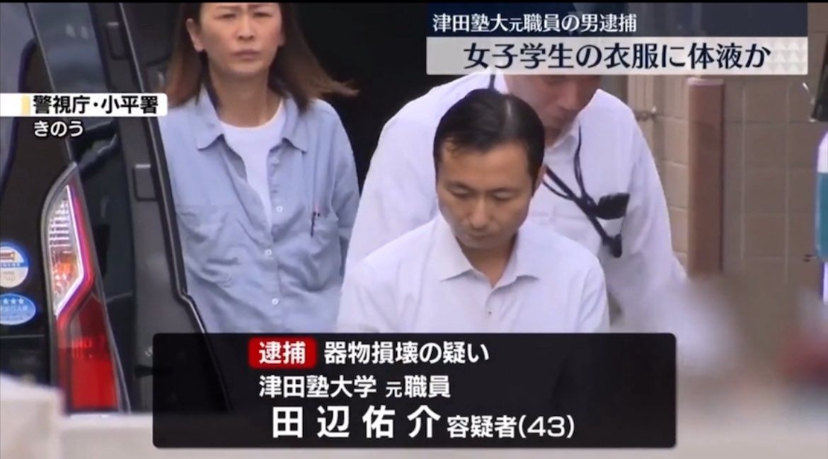 10月7日に警視庁保安課が器物損壊容疑で逮捕したと発表したのは、東京・江東区在住の田辺佑介容疑者(43)。容疑は当時勤務していた津田塾大学小平キャンパスの構内で、ロッカーから女子学生の衣類を抜き取り、体液をかけて汚したというものだった。「’09年から今年の夏まで同大学に勤務していた田辺容疑者は、’24年11月ごろから今年の7月ごろにかけて、小平キャンパス内の廊下に設置された学生用のロッカーから、女子学生の運動着であるハーフパンツを抜き取り、自身の体液をかけて汚していました。そしてその様子を写真に撮り、インターネットの掲示板に投稿していたのです。