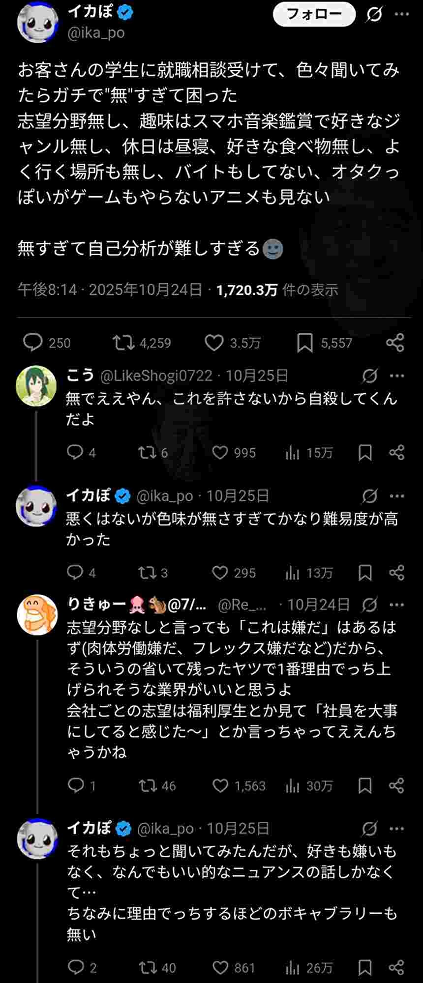 X「学生に就職相談受けたけど″無″すぎて困った」(´ん`)…