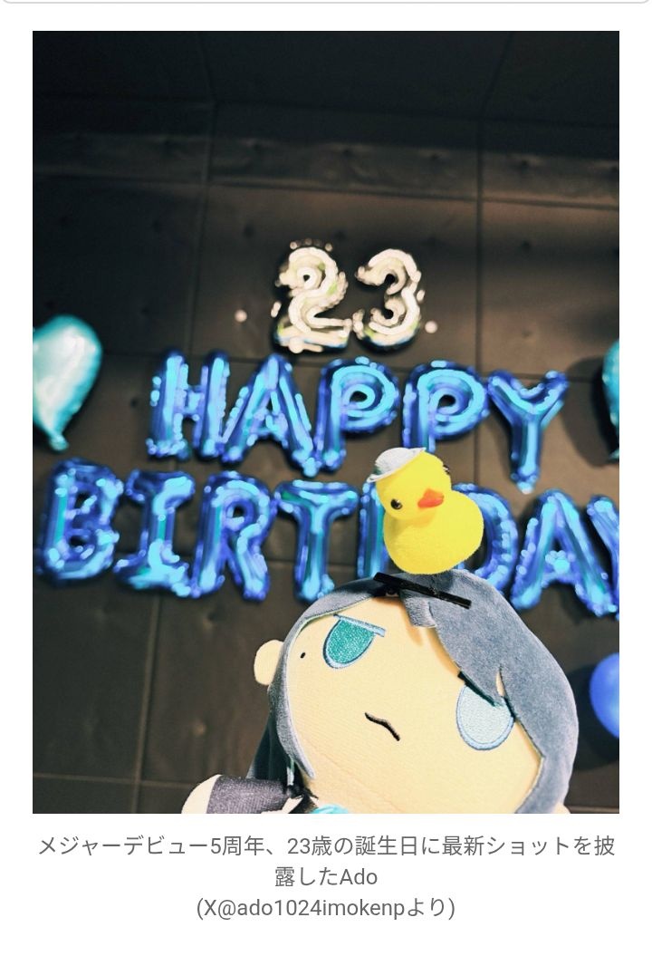 「23 HAPPY BIRTHDAY」の飾り付けをバックに、アヒルを頭に乗せたAdoのぬいぐるみ写真をXに投稿している。