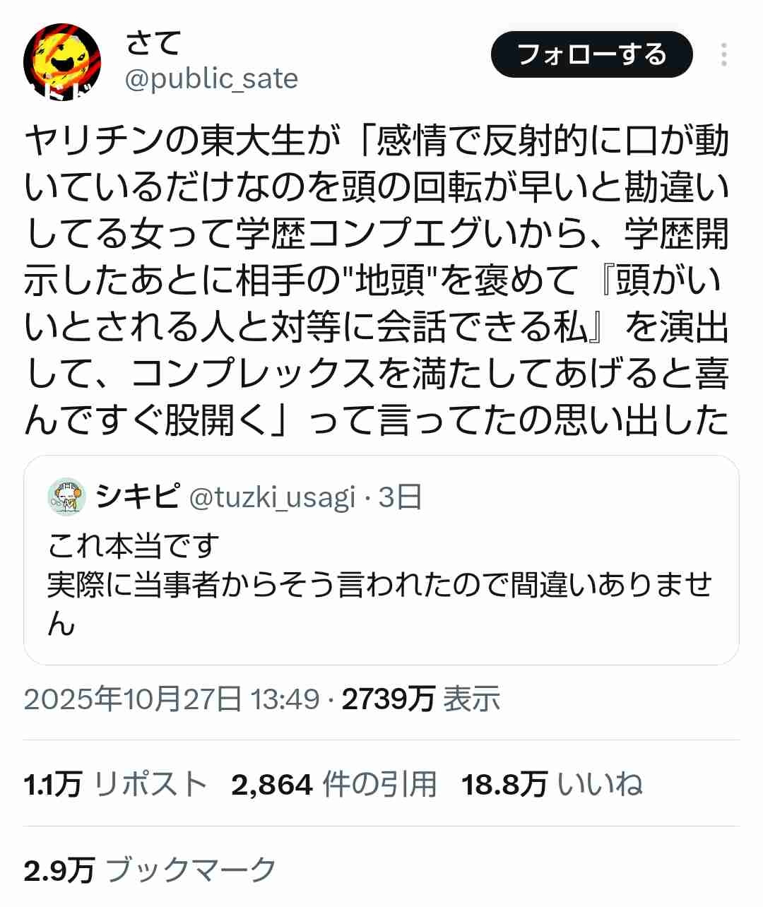 東大生「『地頭のいい女』は学歴コンプエグいか『頭がいい人と会話できる私』を演出してあげると喜んで股開く」