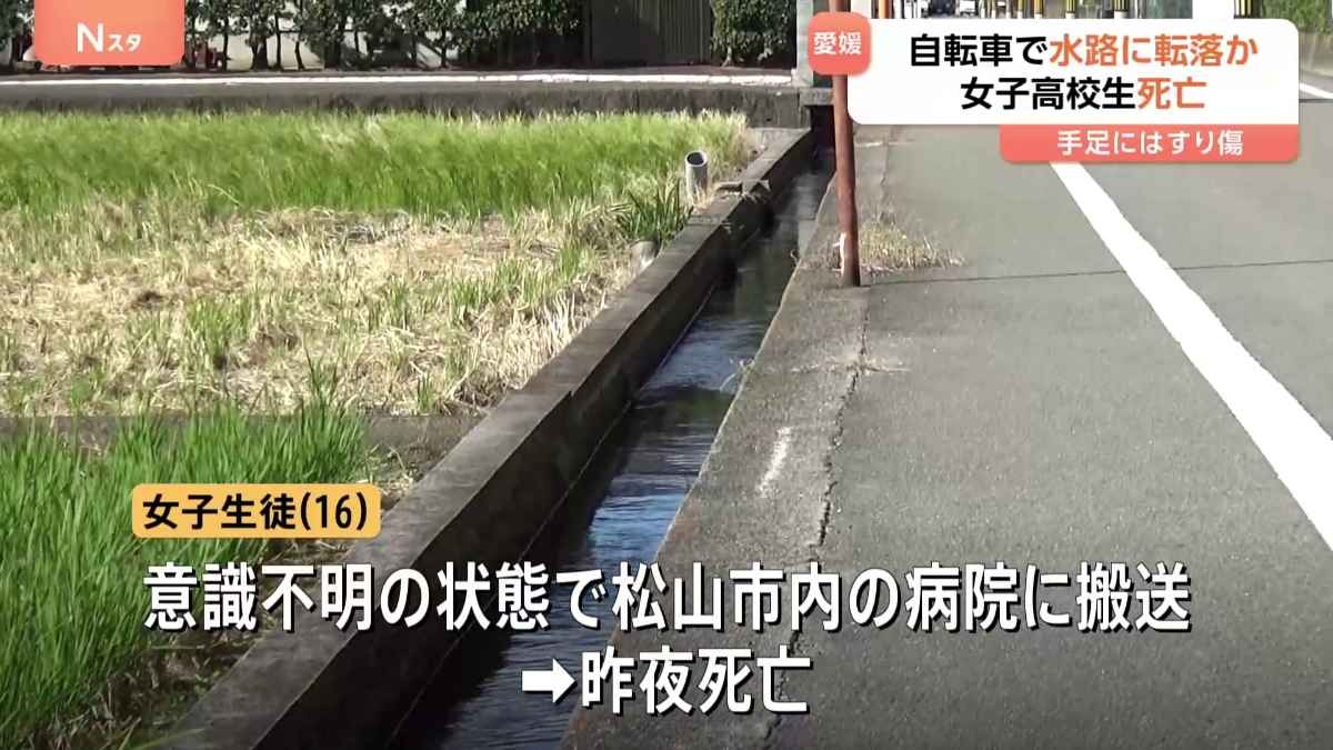 おととい、愛媛県松前町の水路で16歳の女子高校生が倒れているのが見つかり、搬送先の病院できのう夜、死亡しました。そばには自転車も落ちていて、警察は高校生が水路に転落したとみて調べています。