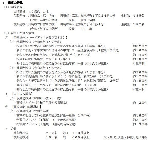 USBメモリなどには、中原中学校に加え教員が以前勤めていた川崎市立日吉中学校の生徒計406人分の氏名や住所、写真、評価、テストの回答など1770件超の情報を保存・記載していた。