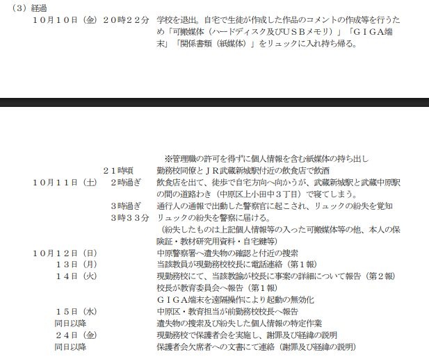 川崎市教育委員会は一連の事態について「当該教諭は個人情報が含まれる可搬媒体などを持ち帰っているにかかわらず、管理職への届け出をせずに持ち出し、帰宅途中に飲酒をするなど個人情報を取り扱っているという意識の欠如と個人情報の管理が徹底できていなかったことが主な原因だった」と説明。