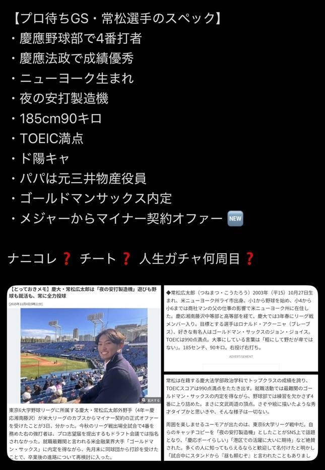 まあでもこういう人の場合マイナーリーグ行って通用しなかったとしてもその後ゴールドマン・サックスでもどこでも入れそうだけど - 9 : 2025/11/05(水) 10:08:59.05 ID:8OPfvZ7q0