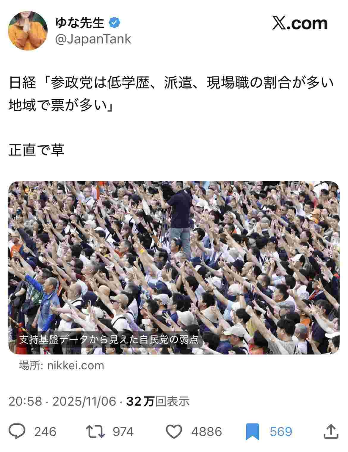 日経「参政党は低学歴、派遣、現場職の割合が多い地域で票が多い」