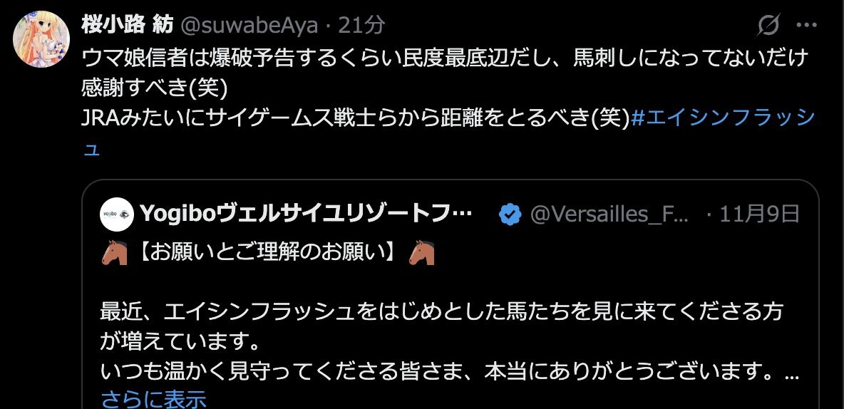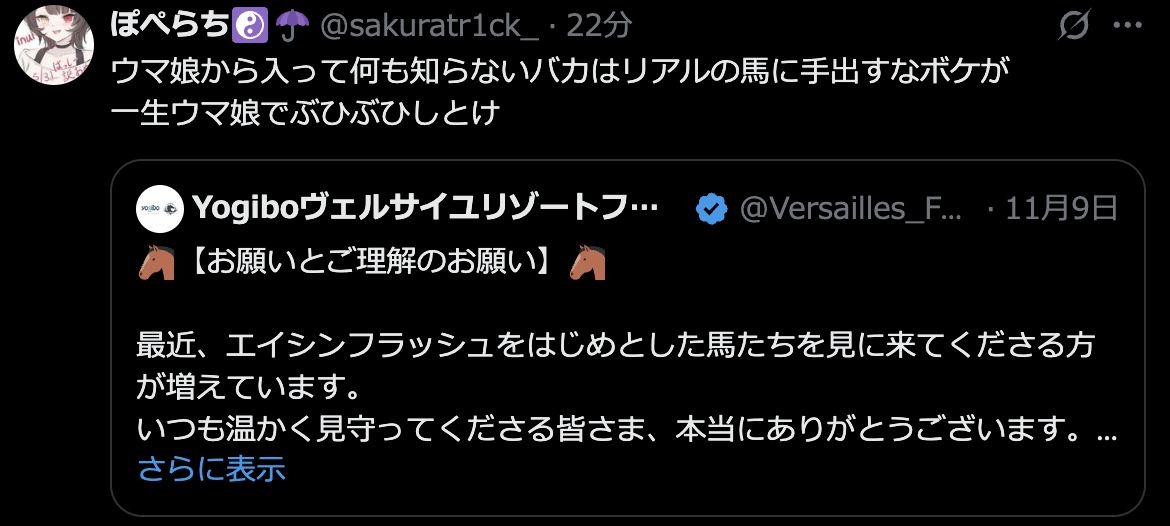 - やらかしてんの馬娘ファンじゃねーよボケっていうツイート見たあとのこいつらの反応見てみたいな
