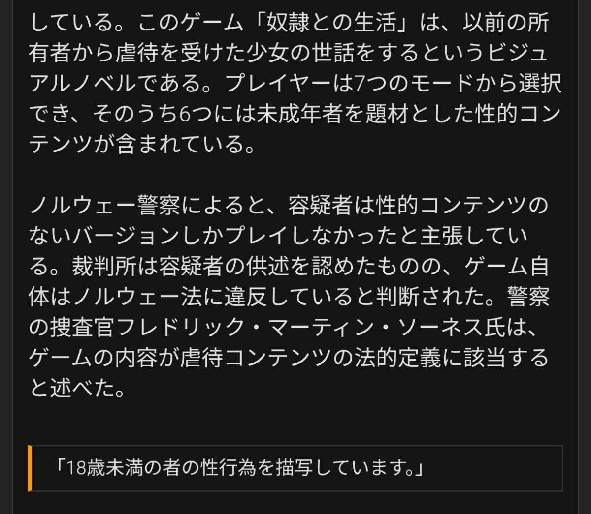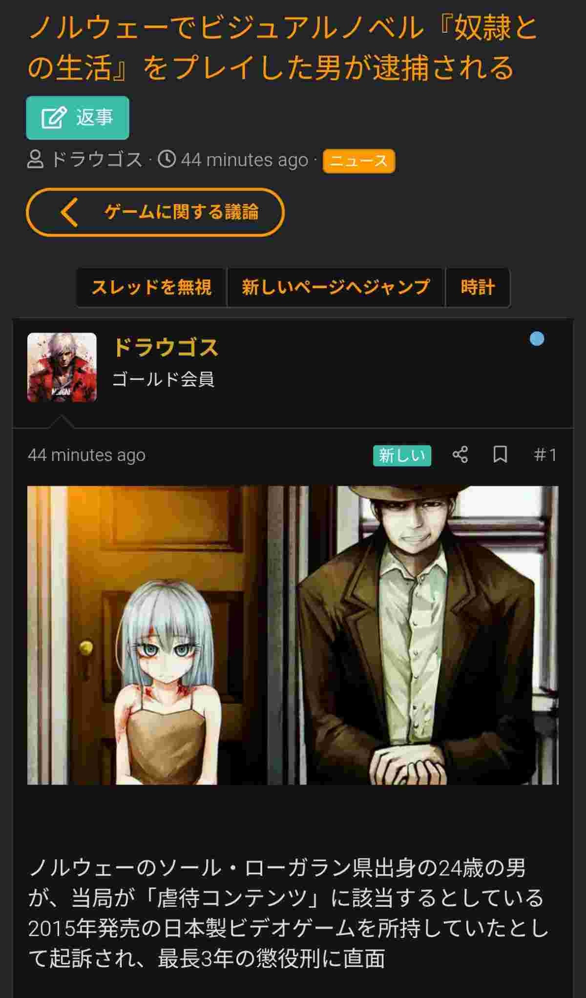 - https://www.neogaf.com/threads/man-arrested-in-norway-for-playing-visual-novel-dorei-to-no-seikatsu.1690122/