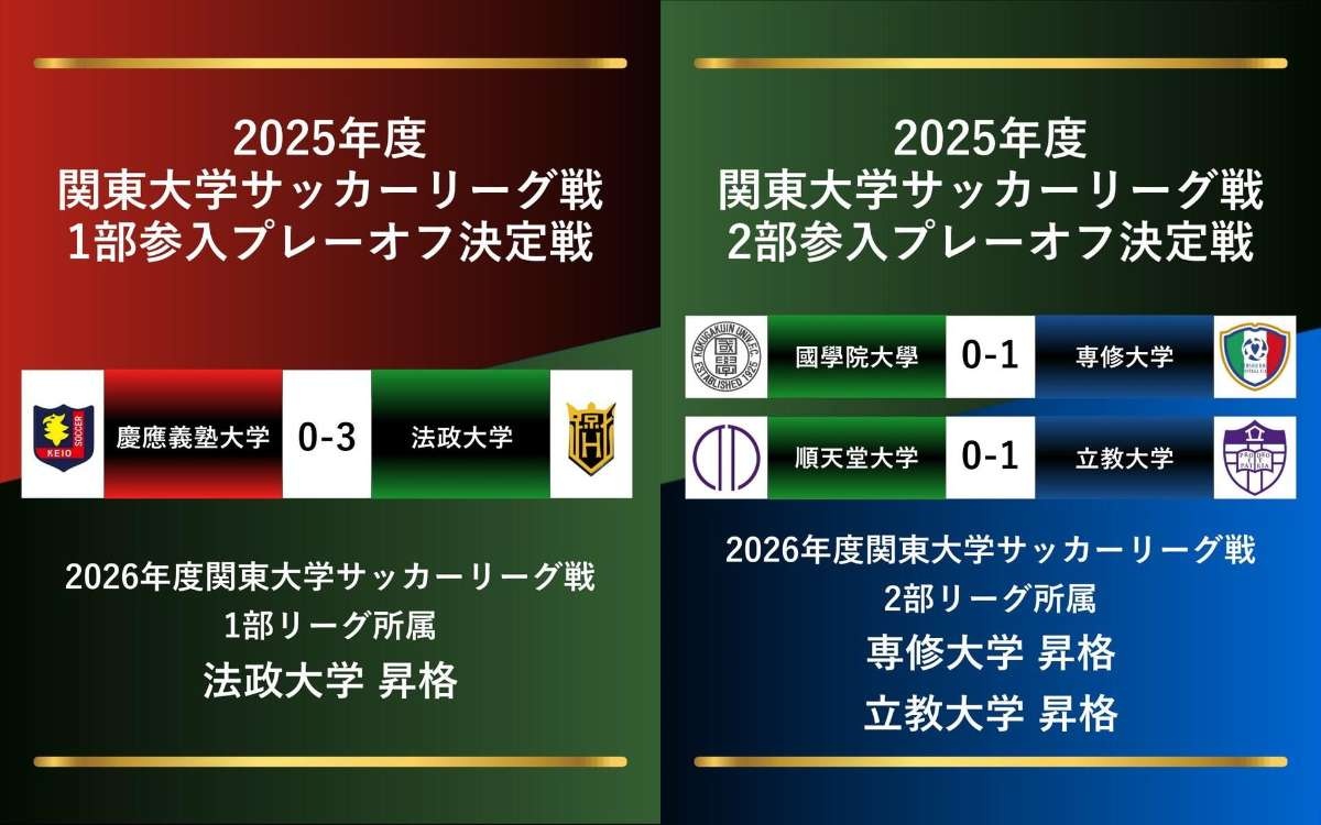 得点者)【法大】小湊絆、浅野直希、島田春人※この結果、法政大学の来季関東1部リーグ昇格と、慶應義塾大学の関東2部リーグ降格が決定。法政大学は来季、2023年以来3年ぶりの関東1部リーグを戦う。