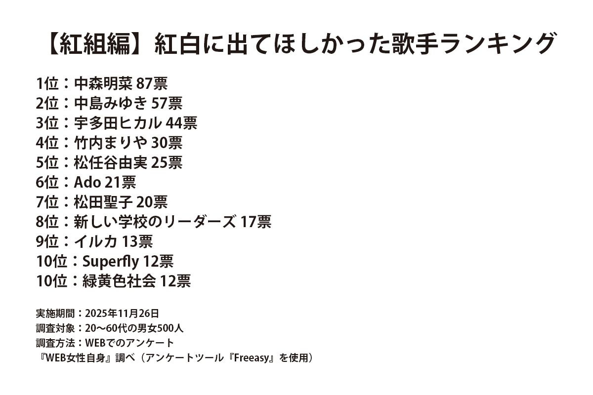 11/29(土) 11:00そこで本誌はWEBアンケートツール「Freeasy」にて、20~60代の男女500人を対象に「紅白に出てほしかった歌手」についてアンケート調査を実施した。本稿では紅組編の結果を紹介する。